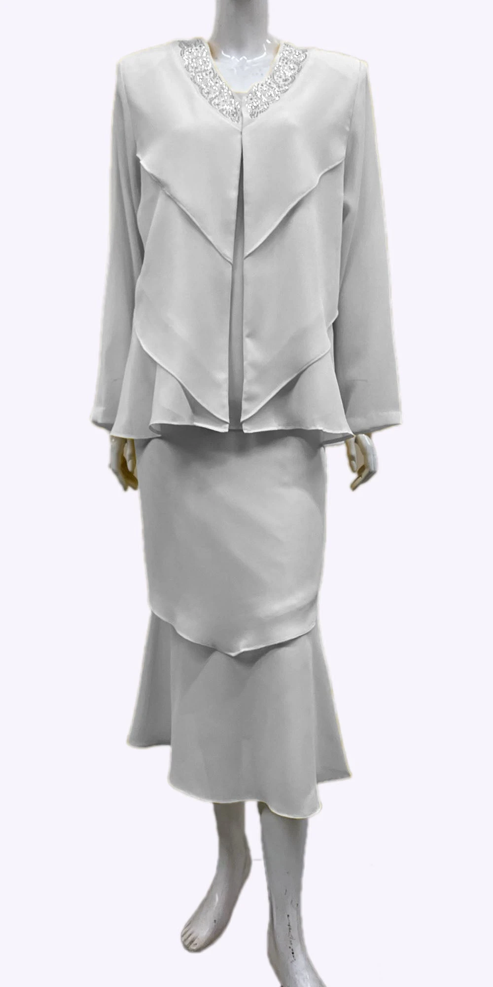 Elevate your special occasion attire with Hosanna Design 5540, 3-piece dress set, made in the USA. The silver beaded embellishments and chevron design add elegance to this modest and comfortable outfit, while the elastic waistband ensures a perfect fit. Includes a long sleeve jacket, sleeveless top, and asymmetrical tea length skirt for a fashionable and versatile look. Plus size available.