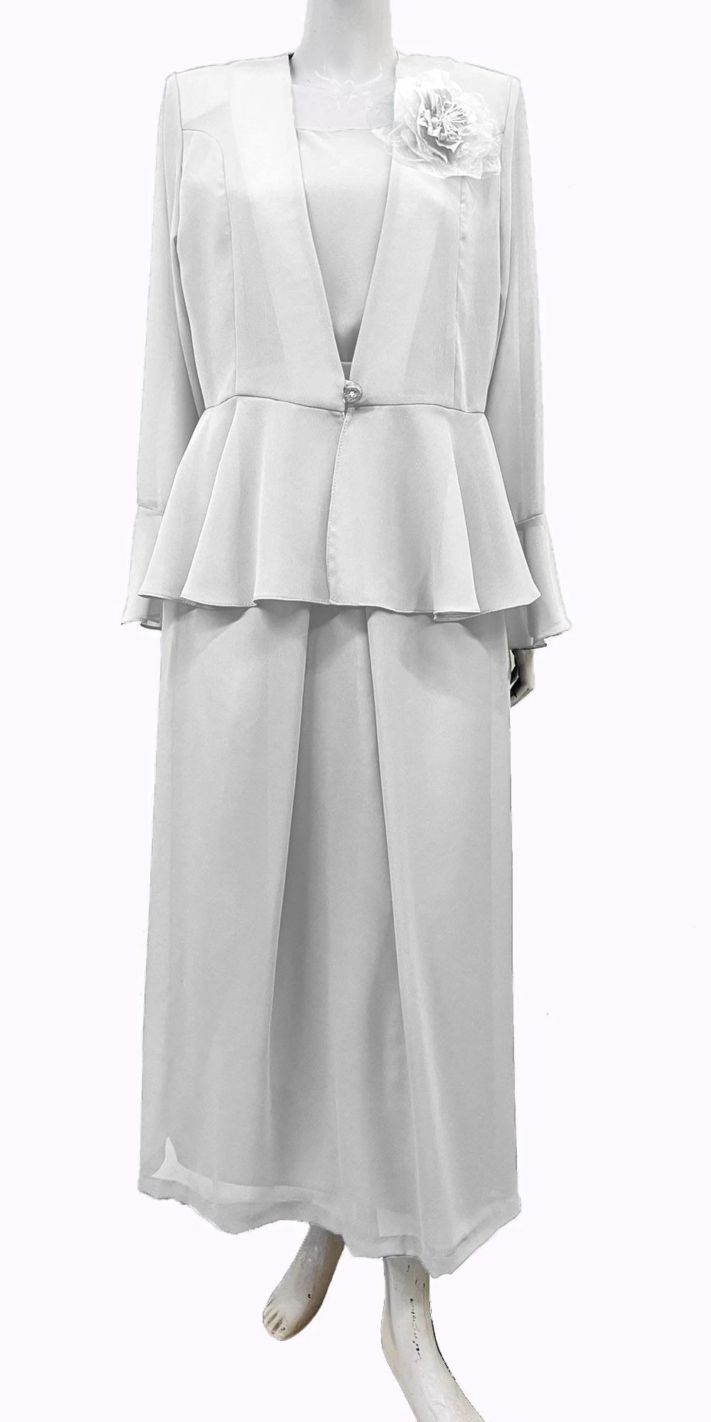 Elevate your special occasion attire with Hosanna Design 5544, 3-piece dress set, made in the USA. The 3D flower add elegance to this modest and comfortable outfit, while the elastic waistband ensures a perfect fit. Includes a long sleeve jacket, sleeveless top, and tea length skirt for a fashionable and versatile look. Plus size available.