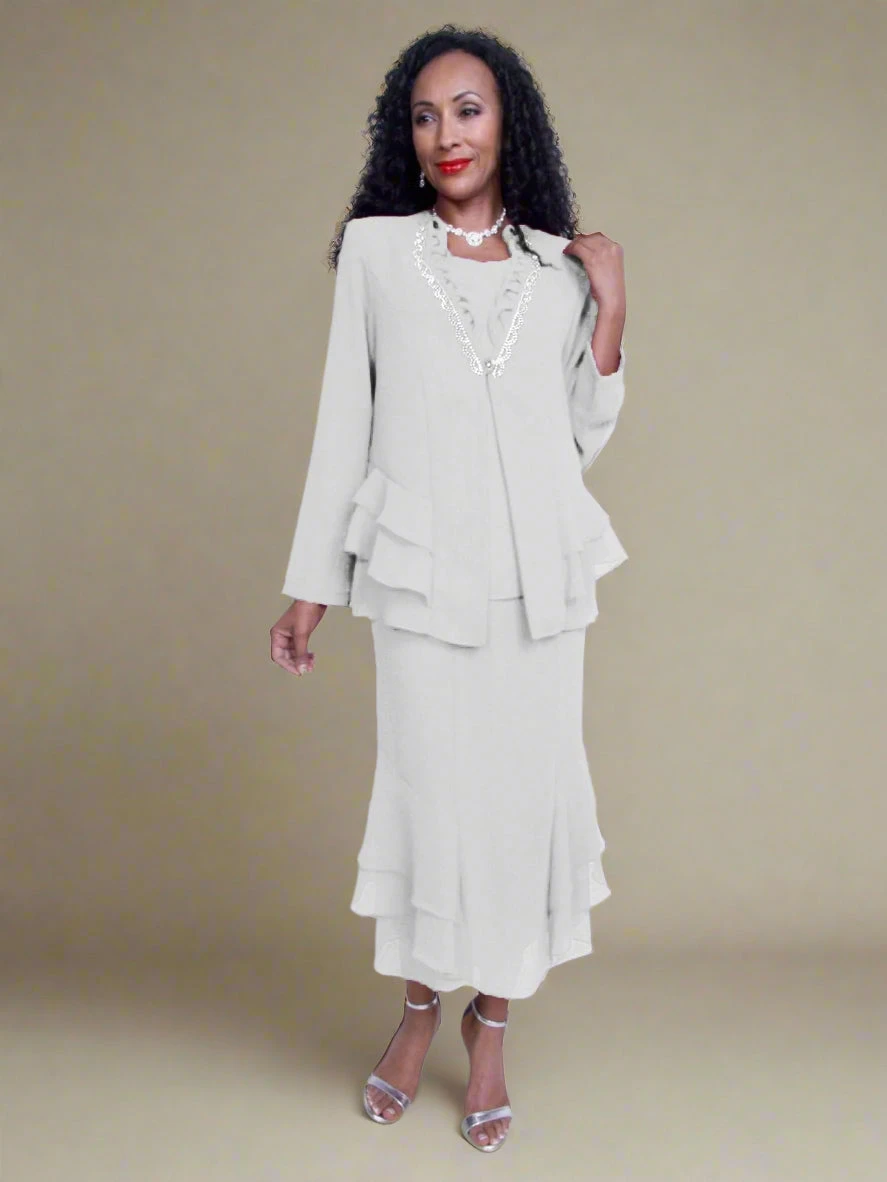 If modesty and classy is important, then you’ll love this plus size 3-piece dress by Hosanna Design 5555 for your next special occasion! This 3-piece set includes a sleeveless top and tea length skirt and features flower applique along the long sleeve jacket and skirt.