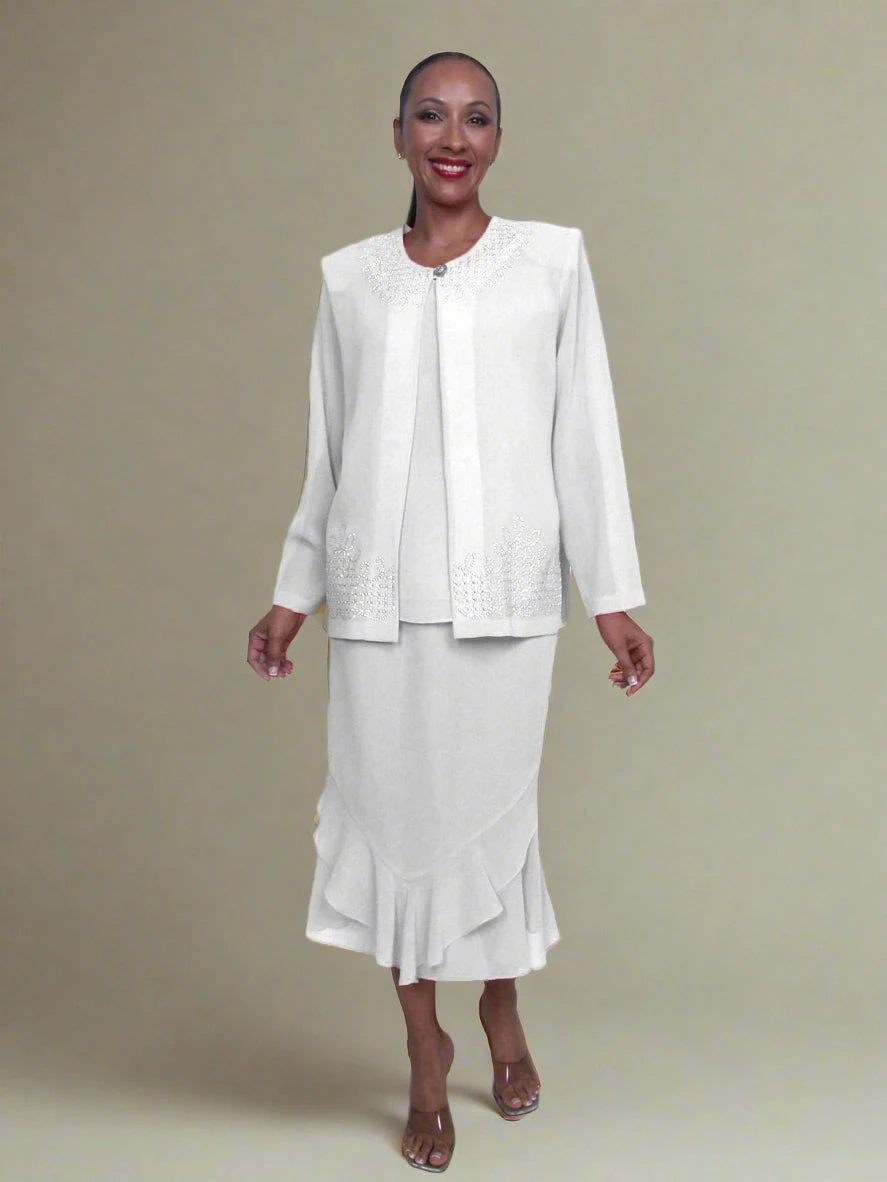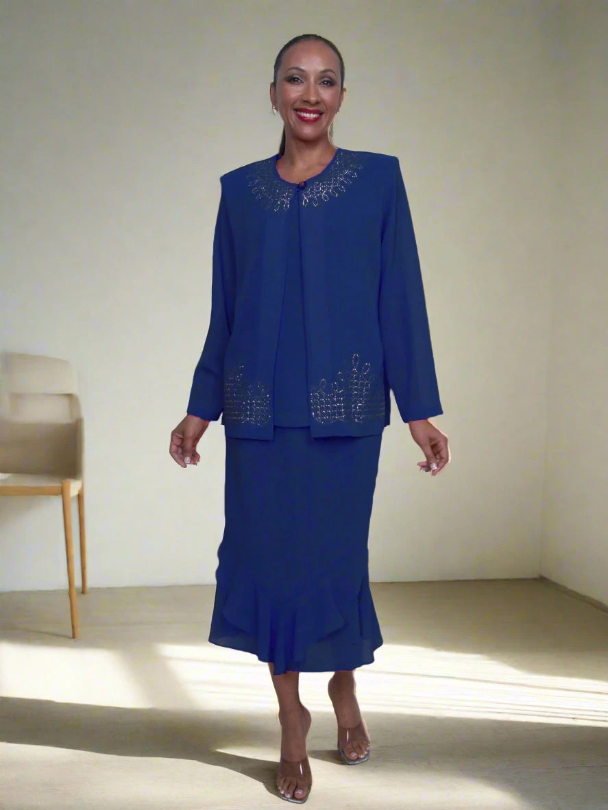 If modesty and classy is important, then you’ll love this plus size 3-piece dress by Hosanna Design 5564 for your next special occasion! This 3-piece set includes a sleeveless top and tea length skirt and features beading along the long sleeve jacket.