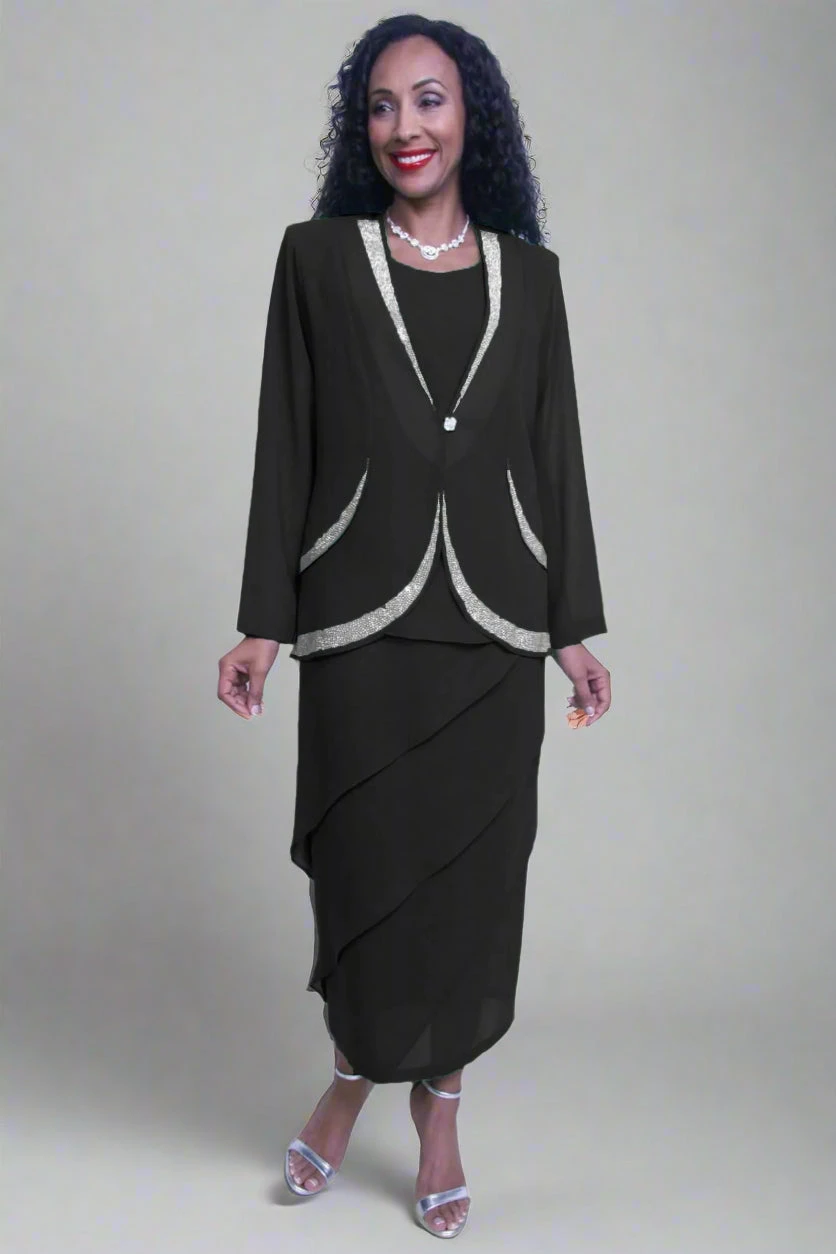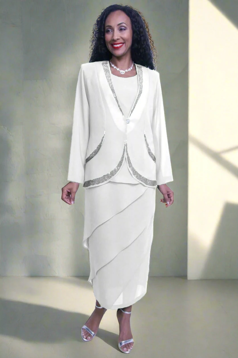 If modesty and classy is important, then you’ll love this plus size 3-piece dress by Hosanna Design 5568 for your next special occasion! This 3-piece set includes a sleeveless top and tea length skirt and a long sleeve jacket