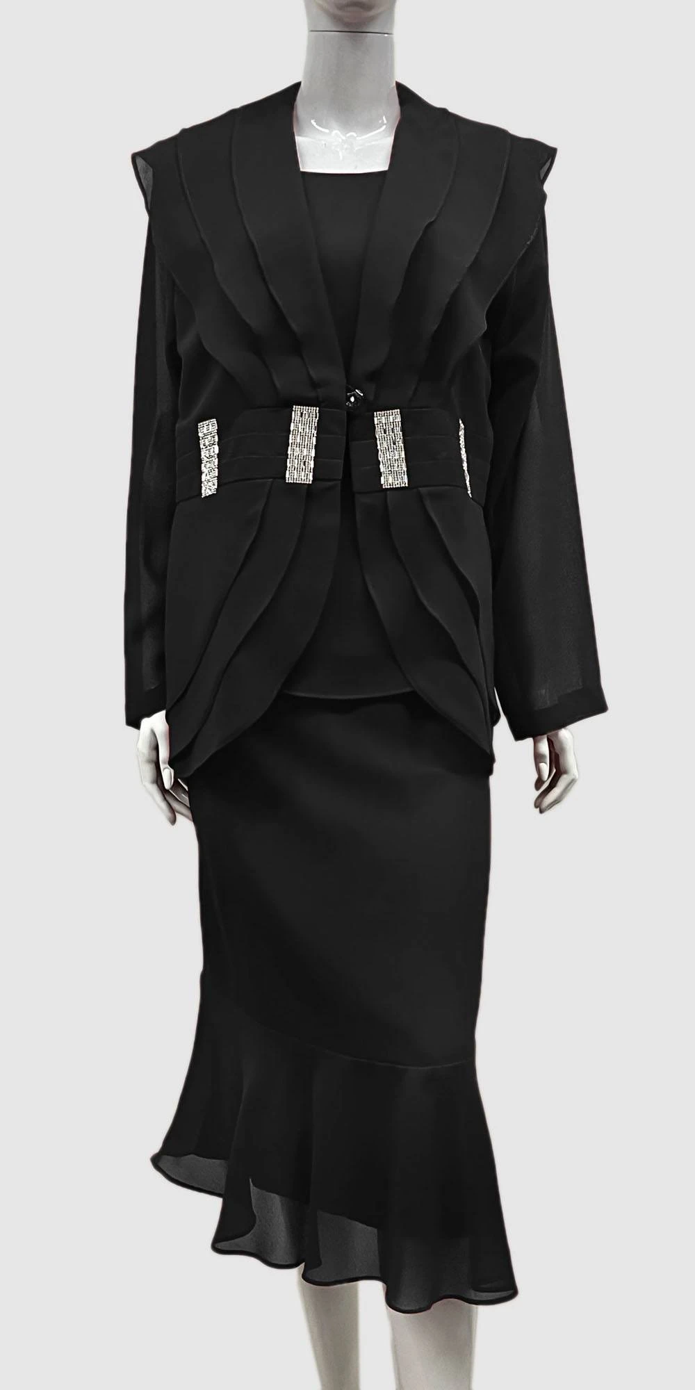 This effortlessly elegant 3-piece dress set from Hosanna Design 5507 is crafted with a pleated jacket design and exudes a modest yet stylish look. The long sleeve jacket and midi length skirt are both enhanced with rhinestones and shoulder pads. Made in the USA, this dress set is sure to be a timeless favorite.