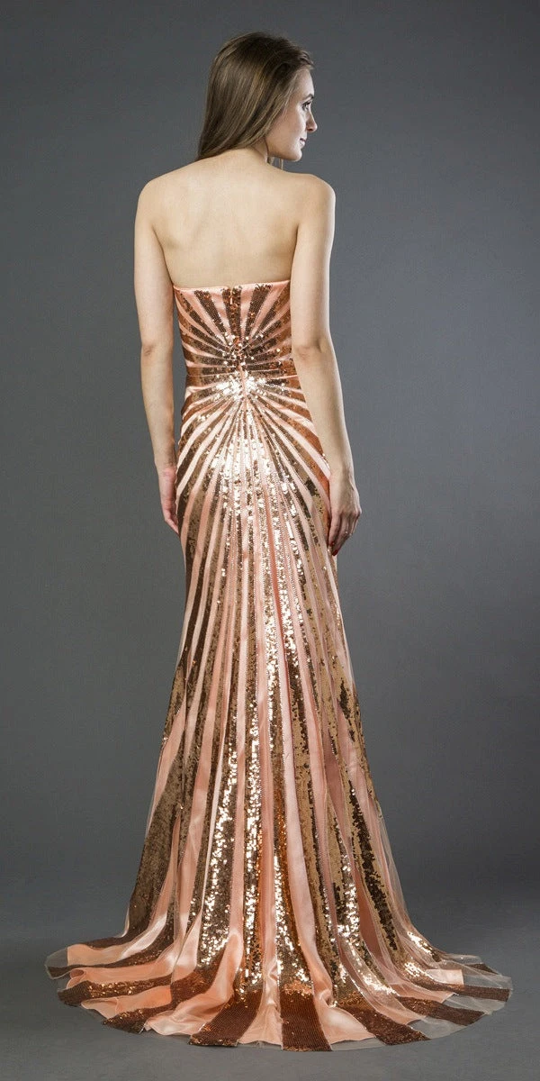 Stand out and shine wearing this floor-length dress by J&J Fashion USA 1428. Made of mesh and sequins, an art deco inspired gown with silky satin lining. This is the strapless gown absolutely remarkable outfit for prom, gala night, red carpet events, pageant or any other formal events.