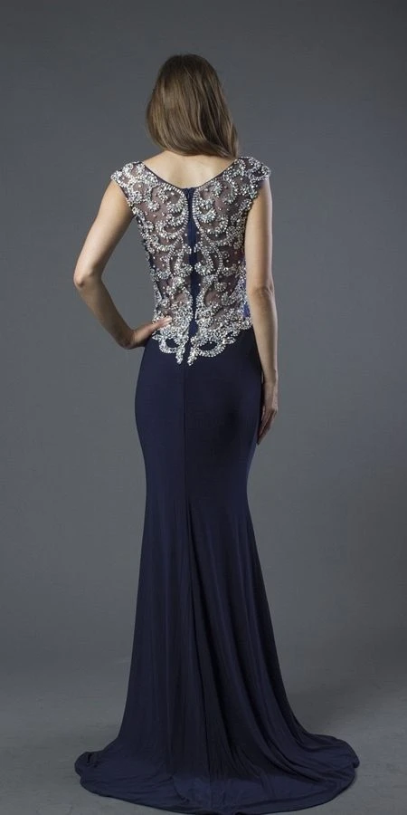 This mermaid silhouette evening gown by J&J Fashion USA 153 is definitely a dream dress! What makes this dress fabulous is the astonishing bead work in the illusion back that outlined the fitted bodice from hollow to the natural waist and the bateau neckline. Excellent outfit for red carpet events, prom, pageant, awards night or any other formal events.