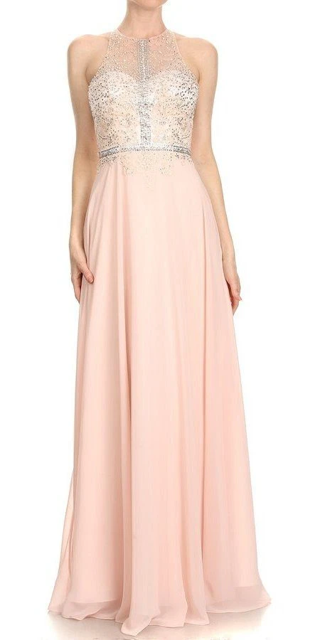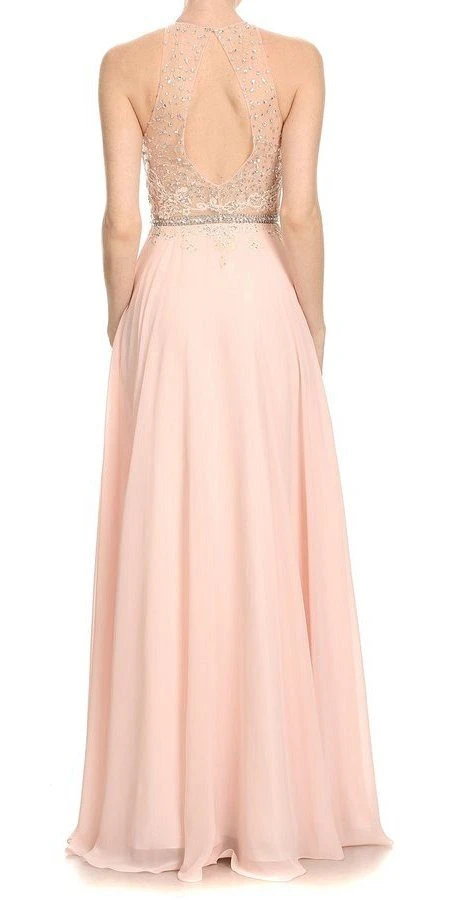 Stand out and shine wearing this halter high-neck with illusion sweetheart lining, the entire sheer bodice enhanced by the glittery beads all through the see-through back with keyhole. The parallel silvery band in the middle of the bodice is the same band that emphasize the natural waist. The chiffon skirt that softly drops down the floor finishes the remarkable look of this A-line silhouette gown by J&J Fashion USA 3029. An ideal outfit for prom, awards night, gala or any other formal occasions.