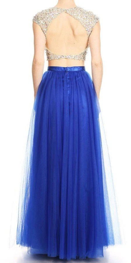 Stand out and shine with this trendy two-piece style gown by J&J Fashion USA 3036. The crop top is encrusted with iridescent rhinestones, has plunging v-neckline, short sleeves and a cut-out in the back. Surely a jaw-dropping outfit in prom, pageant or in any other special celebrations.
