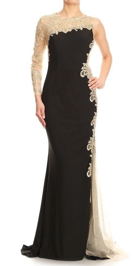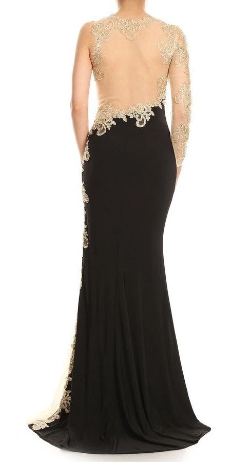 Looking for an extraordinary outfit for your next special event? Here’s for you! A mermaid silhouette ITY jersey floor-length dress by J&J Fashion USA 3045. Featuring a sheer illusion back, appliqued one long-sleeve and the other side is sleeveless in which the golden appliques cascade down to the hemline. Surely a jaw-dropping outfit for pageant, prom, red carpet or gala night.
