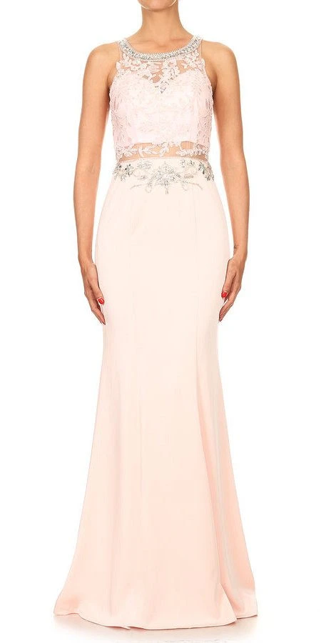 This mermaid style dress by J&J Fashion USA 3058 is definitely a dream dress for prom, galas or any other formal events. The front of the sheer lace bodice is lined with a sweetheart style crop top while the beautiful design of lace revealed in the back. A dazzling rhinestones embellishes the round neckline which adds sparkles and below the sheer-midriff is an intricate beading that completes the fabulous and stunning look of this full-length satin dress.
