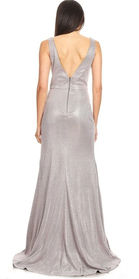 Stand out and shine with this shimmering silver long formal dress by J&J Fashion USA 3084, A stunning column silhouette evening gown with sheer-inset v-neckline and back, thigh-high slit and sweeping train. A fabulous gown perfectly made for red carpet events, pageant, prom, gala dinner party or in any other formal events.