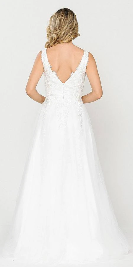 Be elegantly beautiful with this white made of tulle wedding gown by J&J Fashion USA 3087. Featuring an appliqued bodice with v-shape neckline and back with sheer-inset bodice. This a-line silhouette sleeveless gown is an ideal outfit for wedding and debutante or in any other formal occasions.