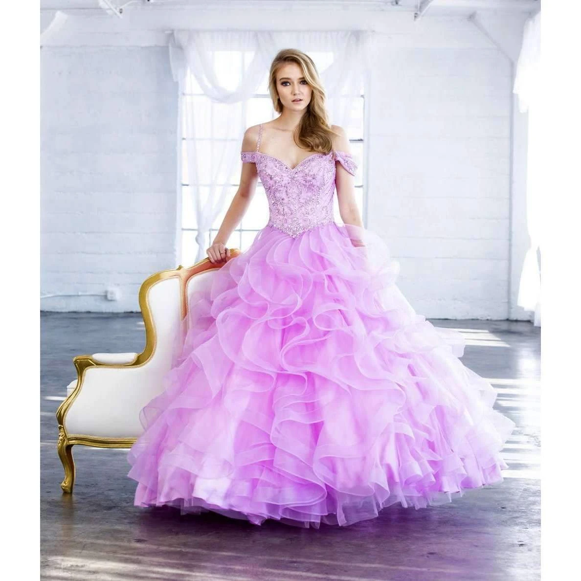 You will dazzle the evening in this magical poofy Cinderella A-line ballgown by Juliet 1421, which features a cold shoulder strap, an intricate beaded bodice and a corset lace up tie back. A beautiful poofy ruffle layered floor length A-line dress for homecoming, a quinceanera, prom or any special occasion!