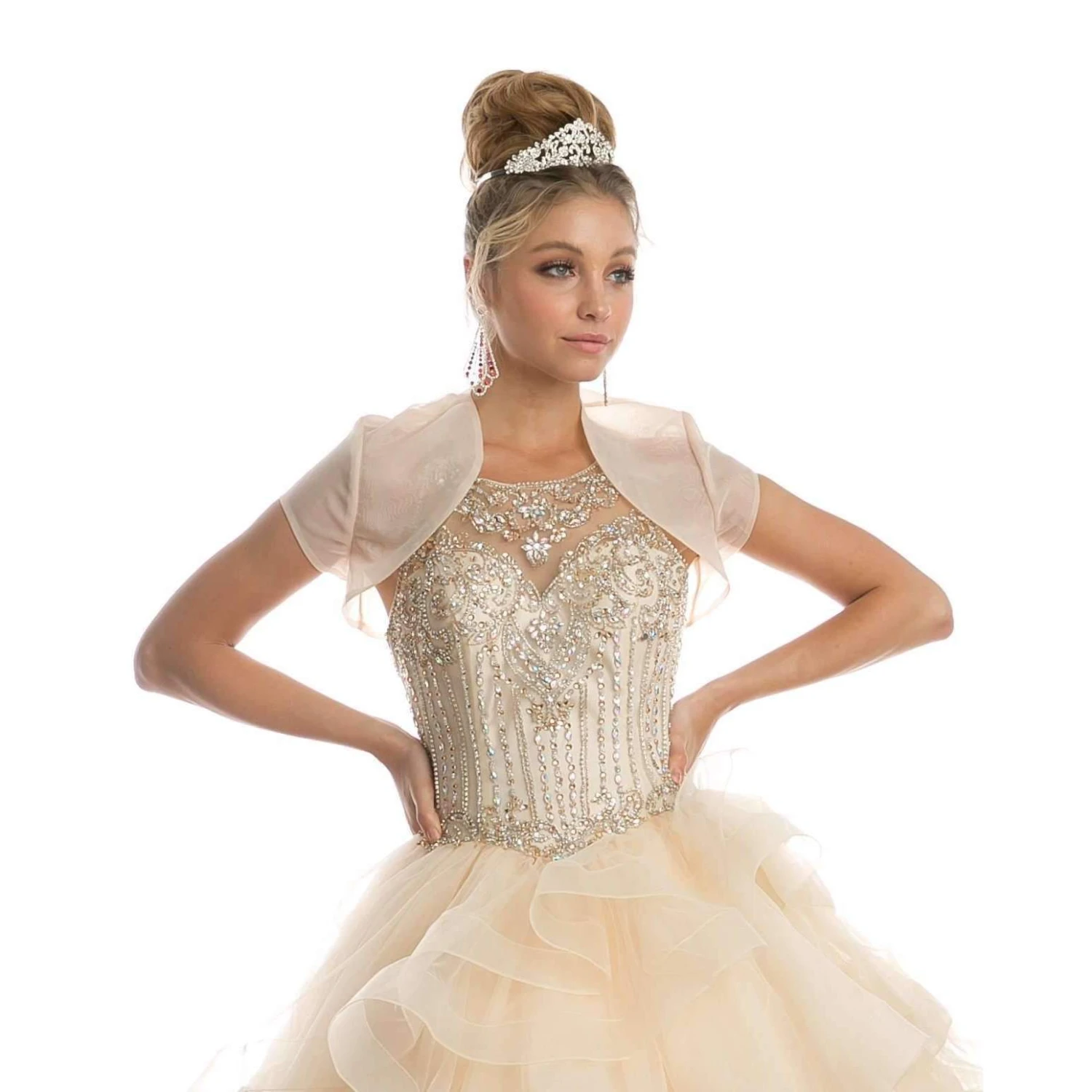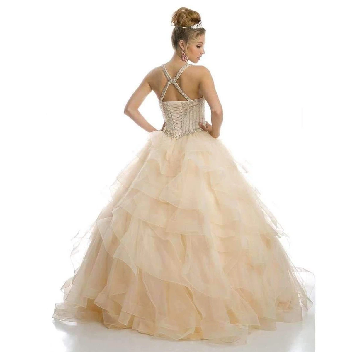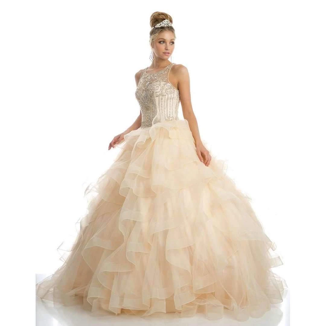 You will dazzle the evening in this magical poofy Cinderella A-line ballgown by Juliet 1423, which features a scoop neckline, an intricate beaded bodice, tiered layered tulle skirt and a corset lace up tie back. A beautiful poofy ruffle layered floor length A-line dress for homecoming, a quinceanera, prom or any special occasion!