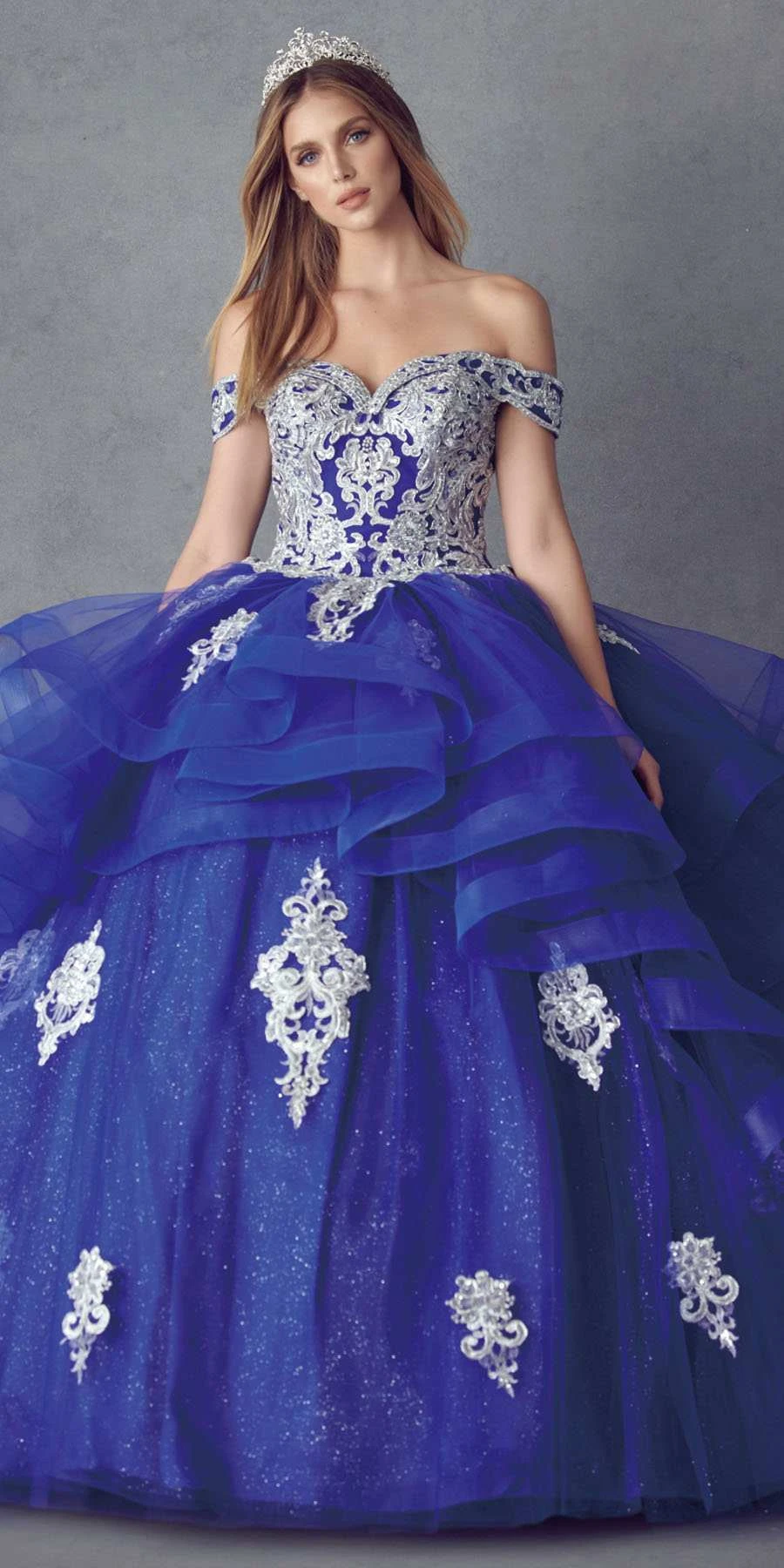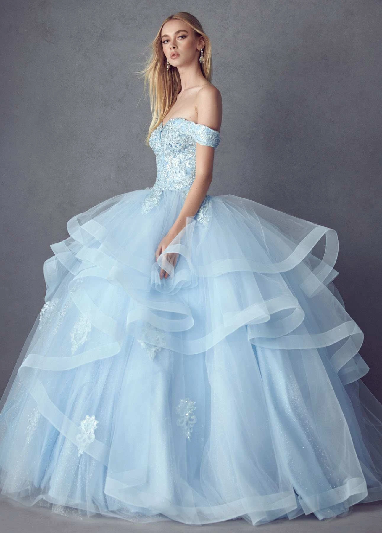 Imagine yourself wearing this floor-length princess ball gown by Juliet 1432. This poofy A-line gown features a metallic embroidered bodice with multi-tulle layering cascading down to the floor. The dress shows off an off the shoulder look and a corset lace up tie back. Surely a perfect dress for a quinceanera, debutante or sweet 16! Order a petticoat to get that poofy ball gown look.
