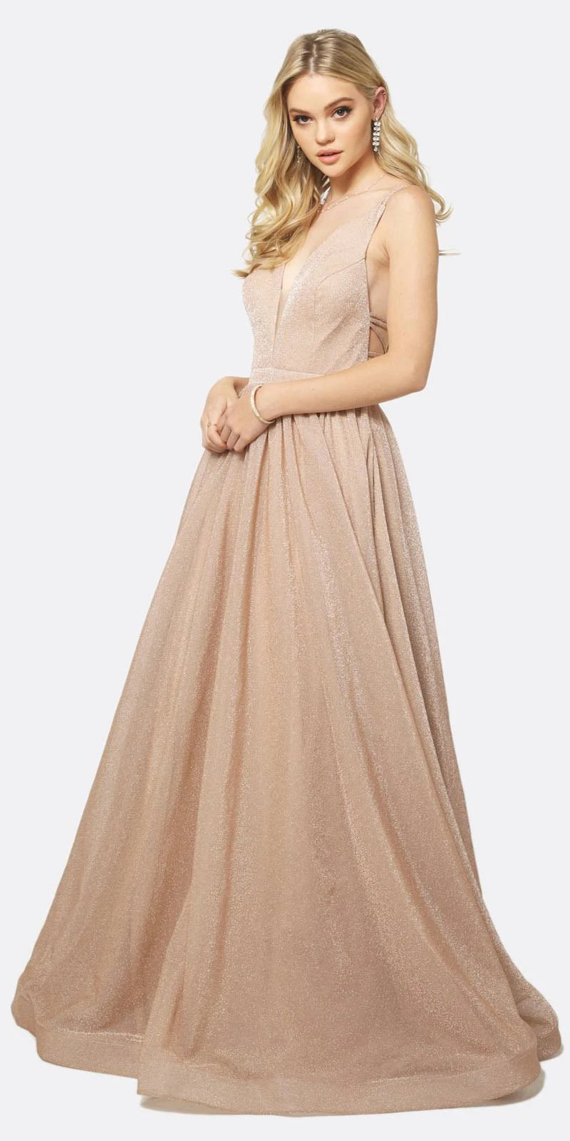 Enjoy the evening in this gorgeous floor length A-line gown by Juliet 201, which features a plunging V-neckline with sheer inset, side pockets and strappy back. A gorgeous long A-line dress for prom, red carpet or any special occasion!