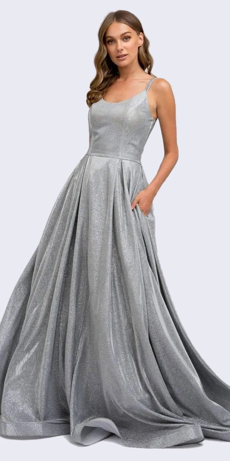 Enjoy the evening in this stunning floor length A-line glitter gown by Juliet 206, which features double straps, side pockets and open back. A beautiful long A-line dress for prom, red carpet or any special occasion!