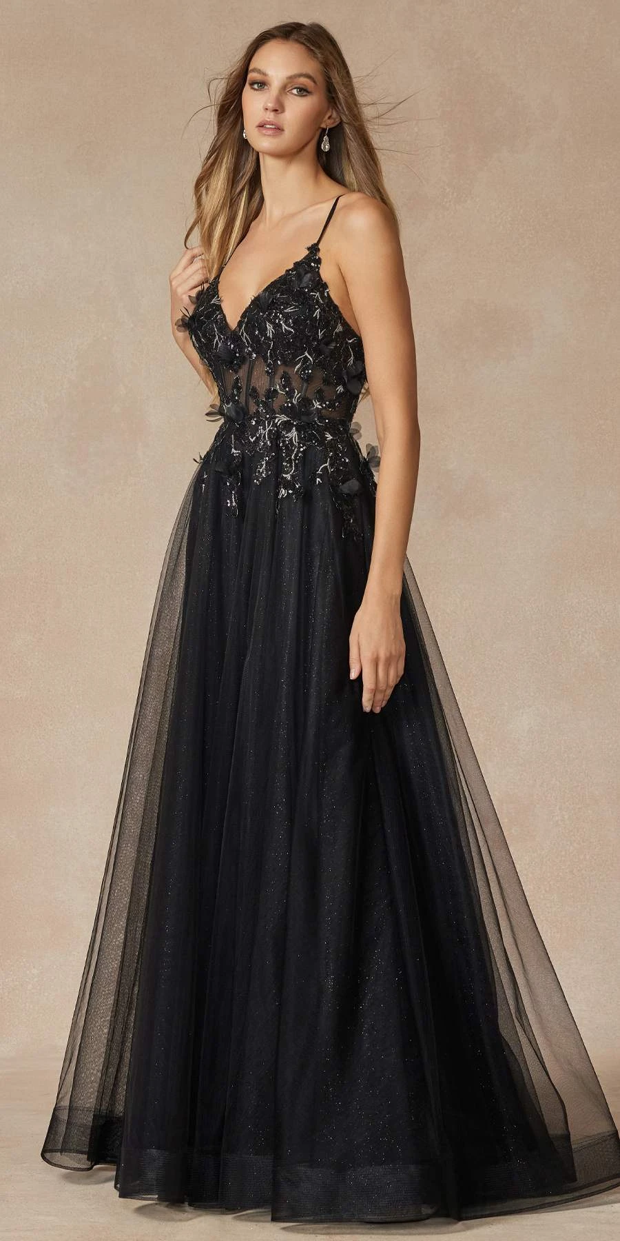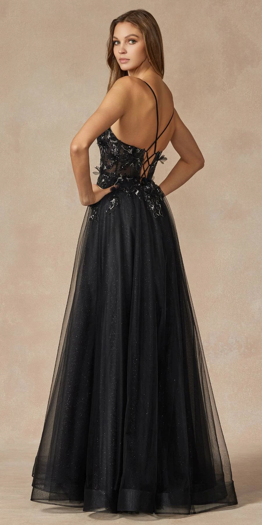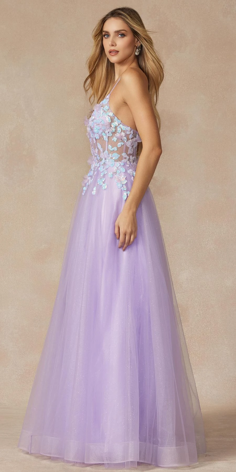 Dazzle the evening in this beautiful floor length A-line dress by Juliet 2401. This long tulle gown has a V-neckline with spaghetti straps and features an illusion boned corset bodice embellished with butterfly sequin embroidered applique, removable puff sleeves and a crisscross strap that laces into a corset tie back. A beautiful dress for formals, gala party, prom or any special occasion!