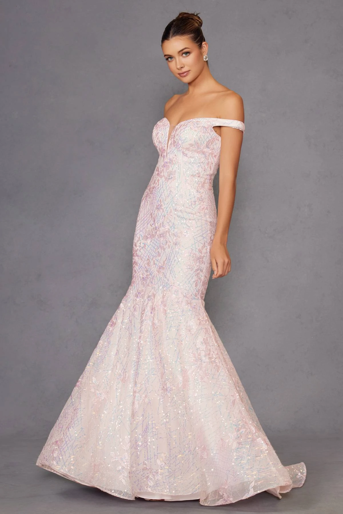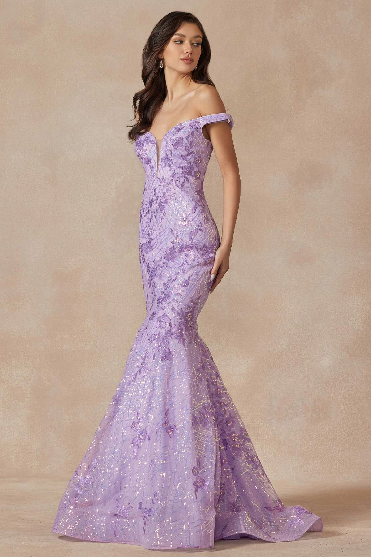 Dazzle the evening in this beautiful floor length fitted dress by Juliet 2412. This long off the shoulder sequin mermaid gown has a plunging sheer panel insert sweetheart neckline and features sequin and embroidered embellishments and an open corset lace up V-back. A beautiful dress for formals, gala party, prom or any special occasion!
