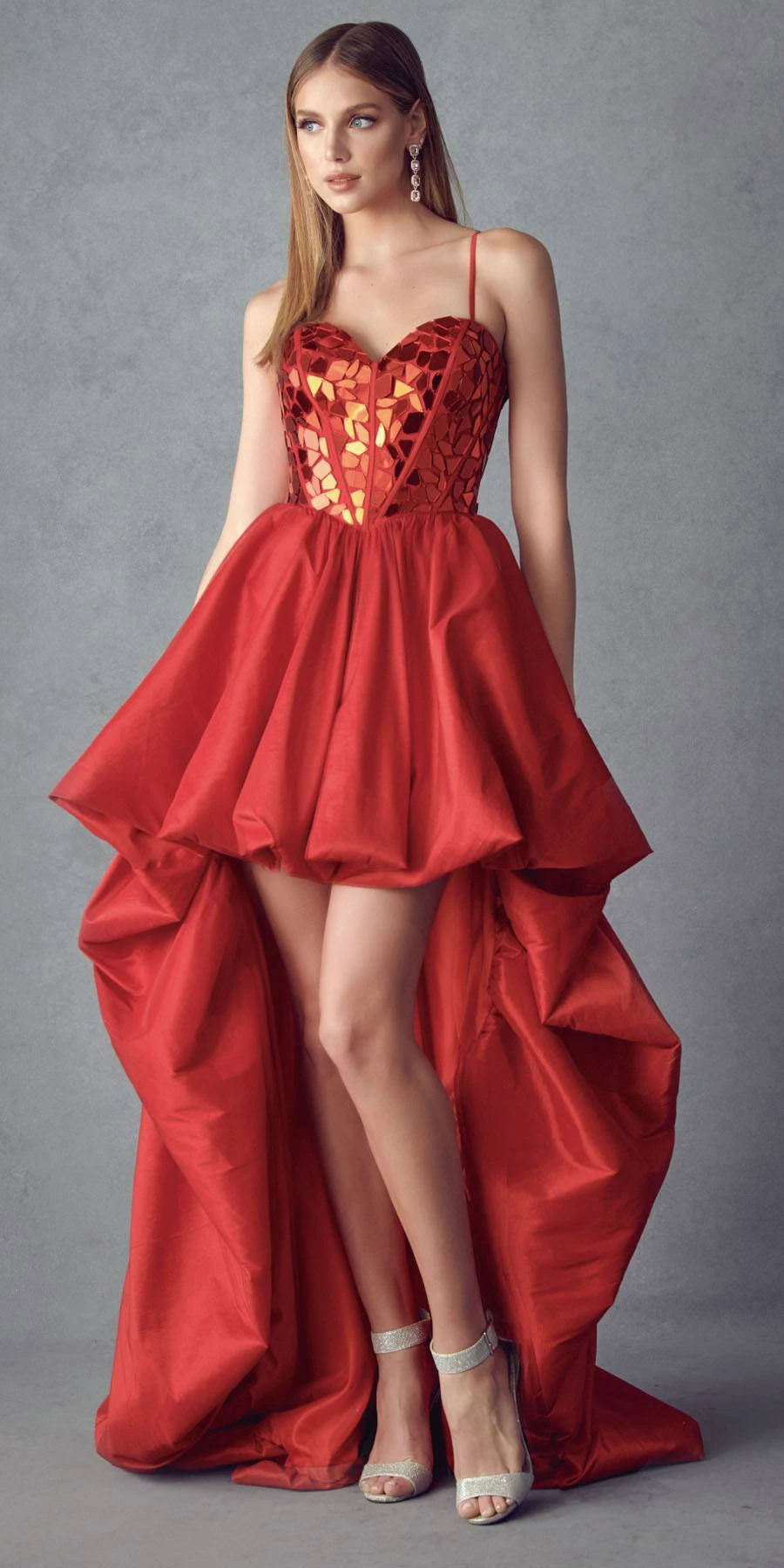Dazzle the evening in this beautiful high-low dress by Juliet 252, which features a glass beaded bodice with and corset lace up tie back. A beautiful high-low dress for homecoming, damas, prom or any special occasion!