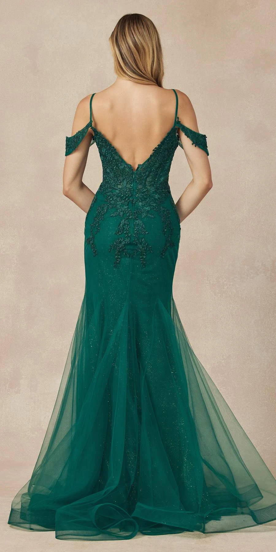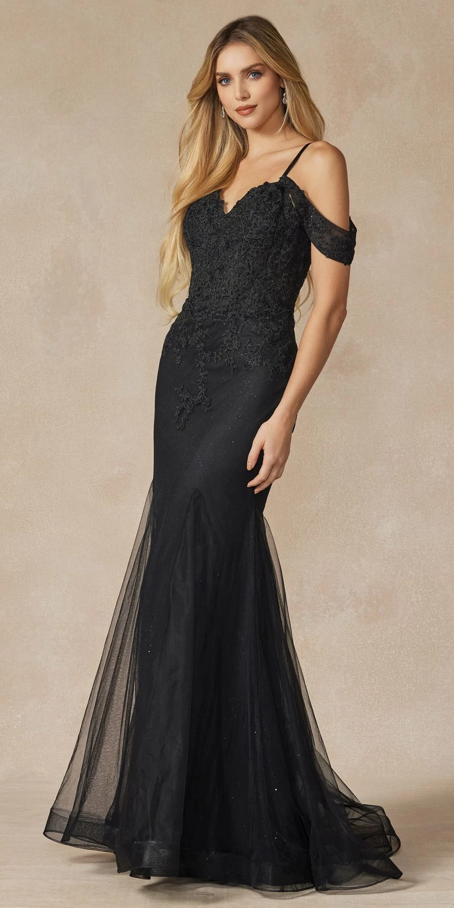 Dazzle the evening in this beautiful floor length dress by Juliet 281. This off the shoulder long gown features an embroidered lace applique bodice, sweetheart neckline, glitter tulle skirt and open V-back. A beautiful dress for formals, gala party, prom or any special occasion!