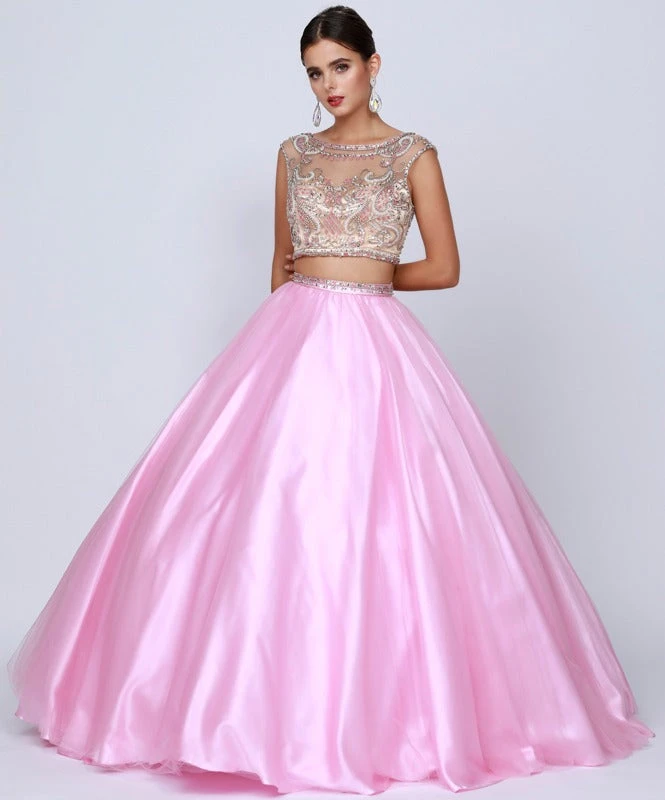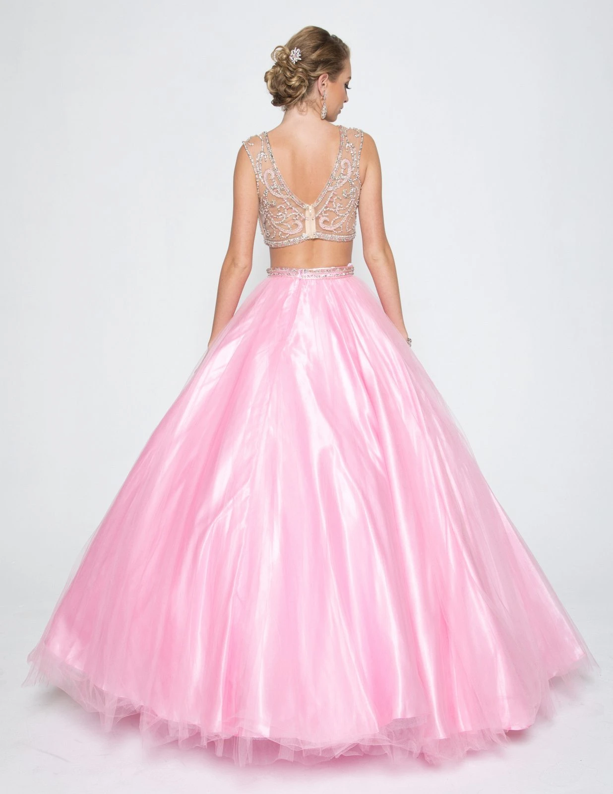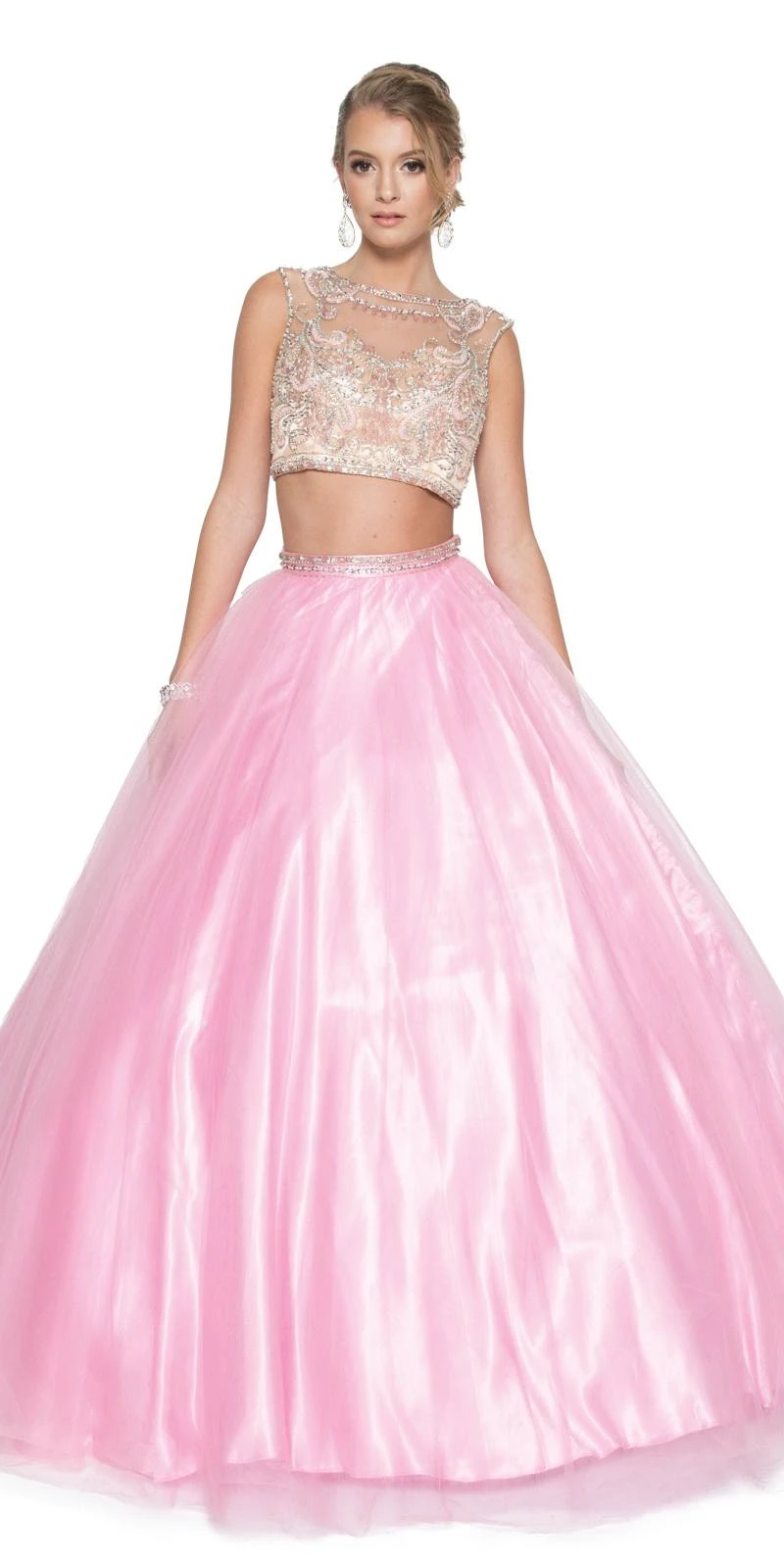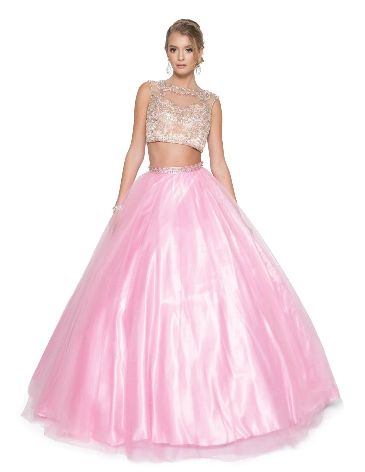 Step into this beautiful 2-piece quinceanera dress by Juliet 338 for your next celebration. This gown features a bateau neckline, cap sleeves and embellished bodice.