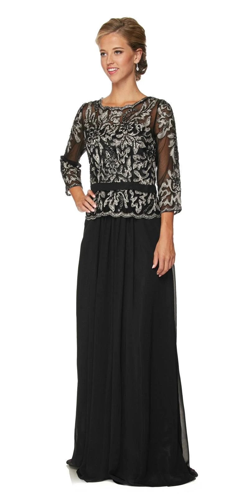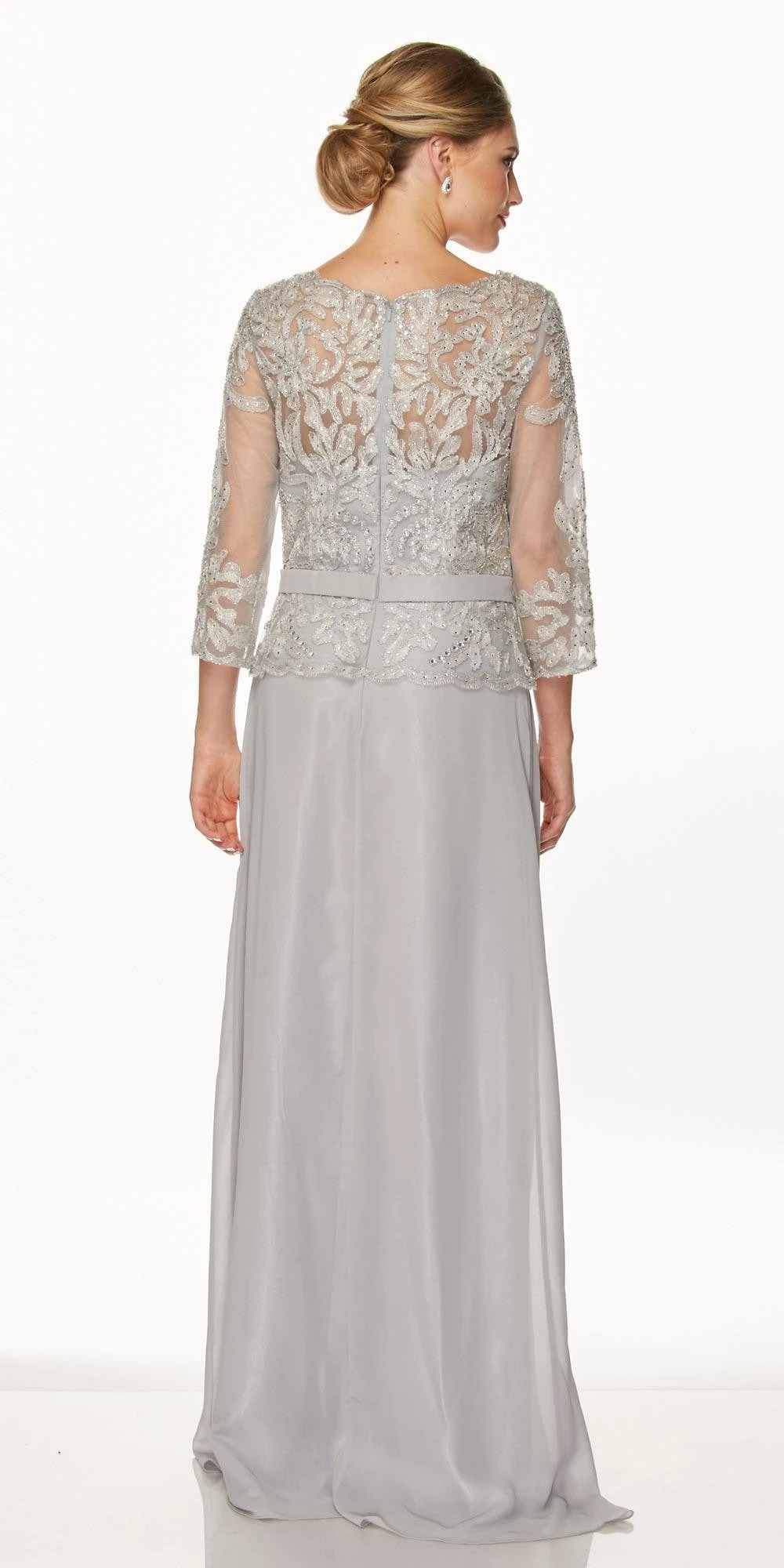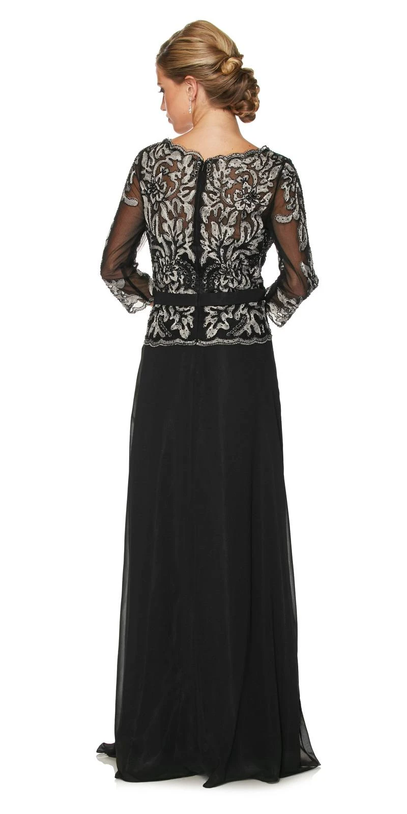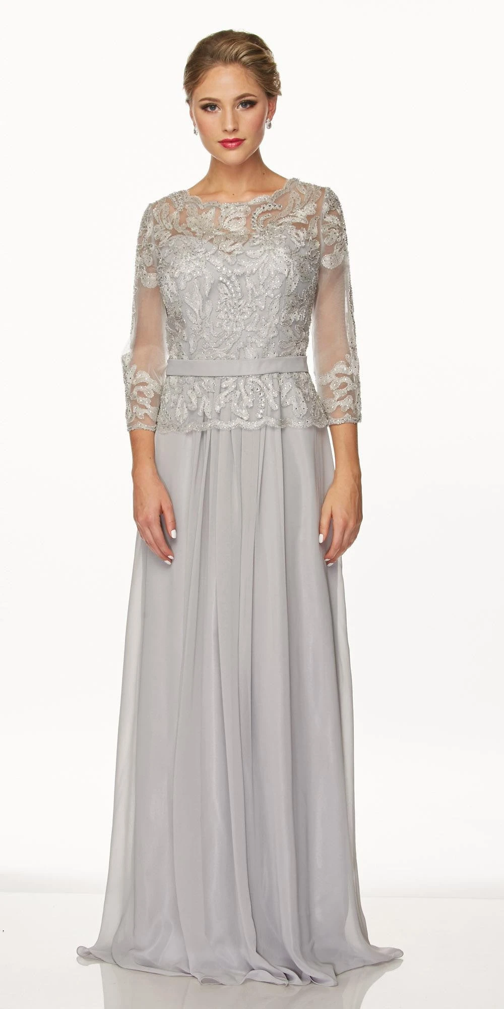 Dress up in this sophisticated long formal gown by Juliet 634. This full length A line chiffon skirt lace top dress has 3/4 length sleeves with a bateau illusion neckline and embroidered with intricate design of appliques and beads.