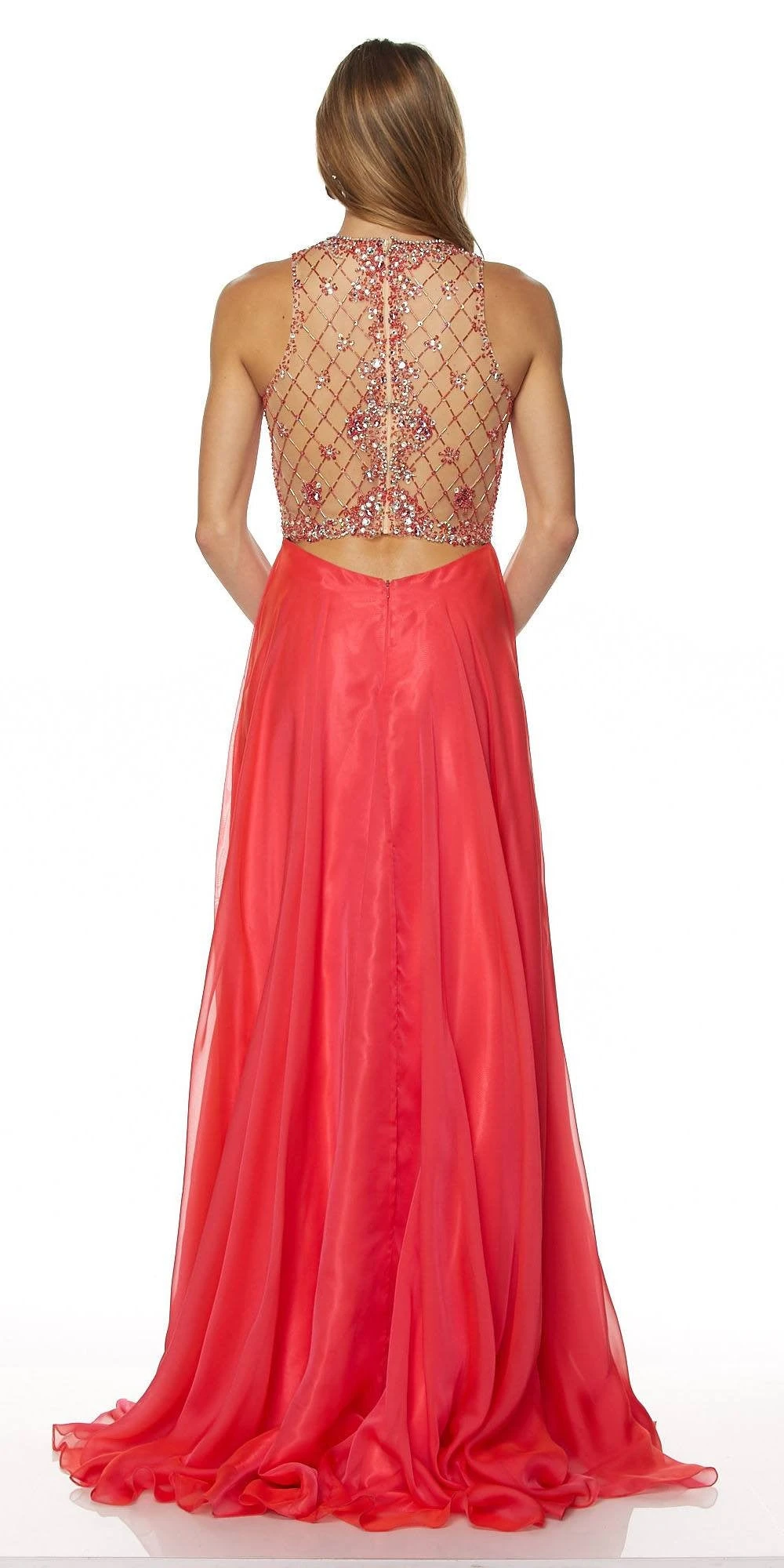 Imagine yourself in this remarkable floor length prom gown. Made with chiffon, this long A-line dress has an illusion halter neckline, rhinestone embellished bodice, cut out back and a sweeping train.