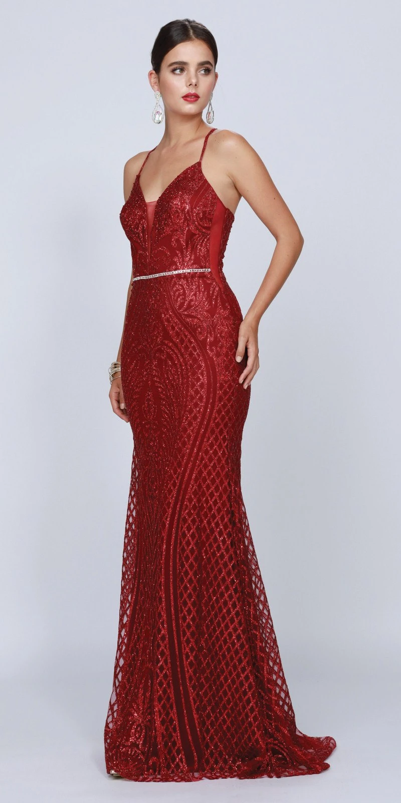 Imagine yourself in this floor-length sequins decorated prom dress by Juliet 681 in burgundy. A designer dress with plenty of amazing details such as sheer cut-outs on the sides of the bodice and a sheer inset on the plunging neckline. The natural waist were emphasized by a strip of sparkling rhinestones and a strappy style back completed the alluring look with full of elegance kind of outfit in any special events such as prom, red carpet events or awards night.