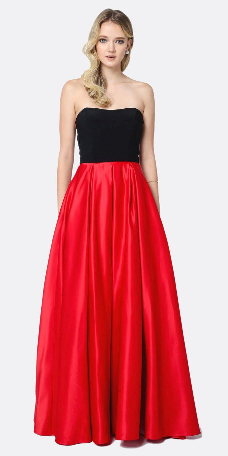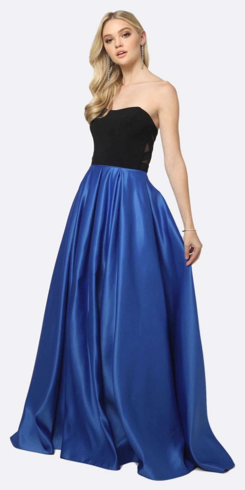 Enjoy the evening in this amazing floor length A-line gown with a contrasting black top by Juliet 694, which features illusion caged side cut outs and pockets on the side. A beautiful long A-line dress for prom, red carpet or any special occasion!