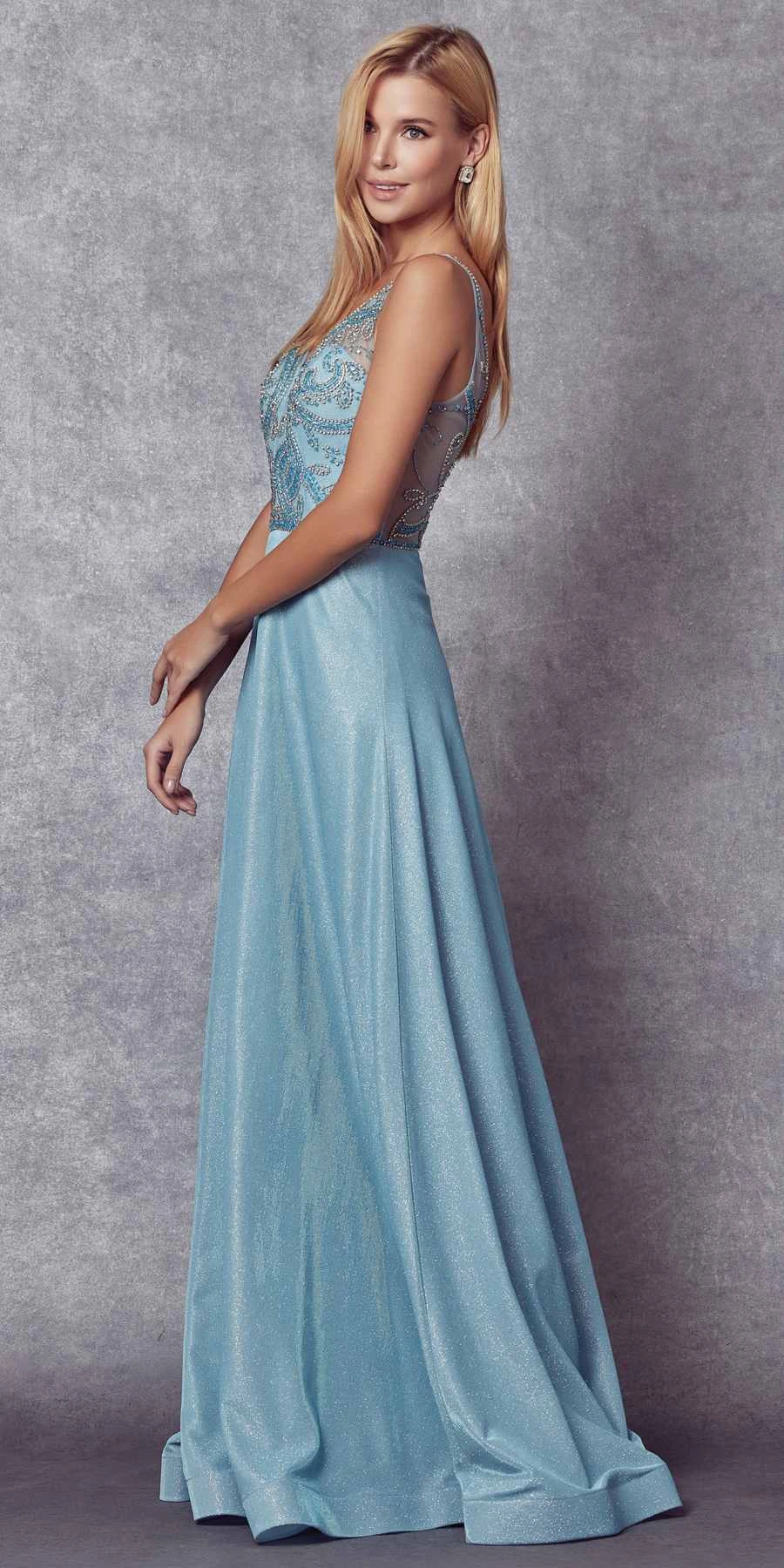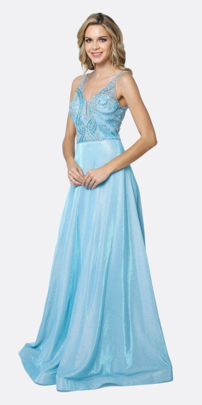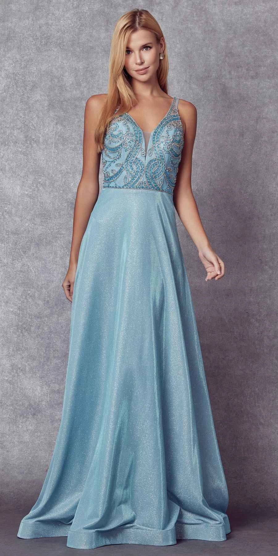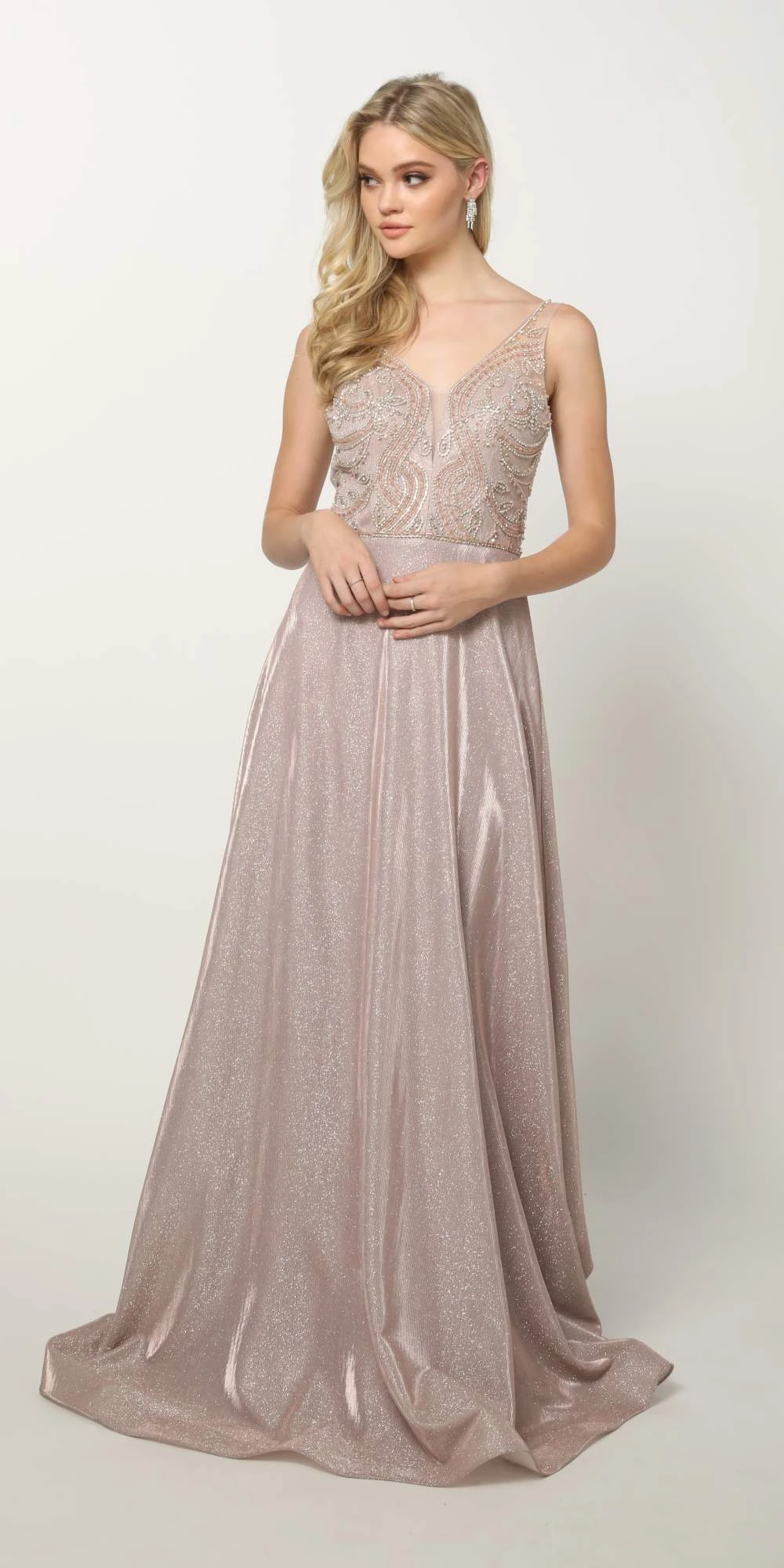 Enjoy the evening in this gorgeous floor length A-line glitter gown by Juliet 699, which features a V-neckline, embellished sheer bodice with rhinestones and beading and an open V-back. A beautiful long A-line dress for prom, red carpet or any special occasion!