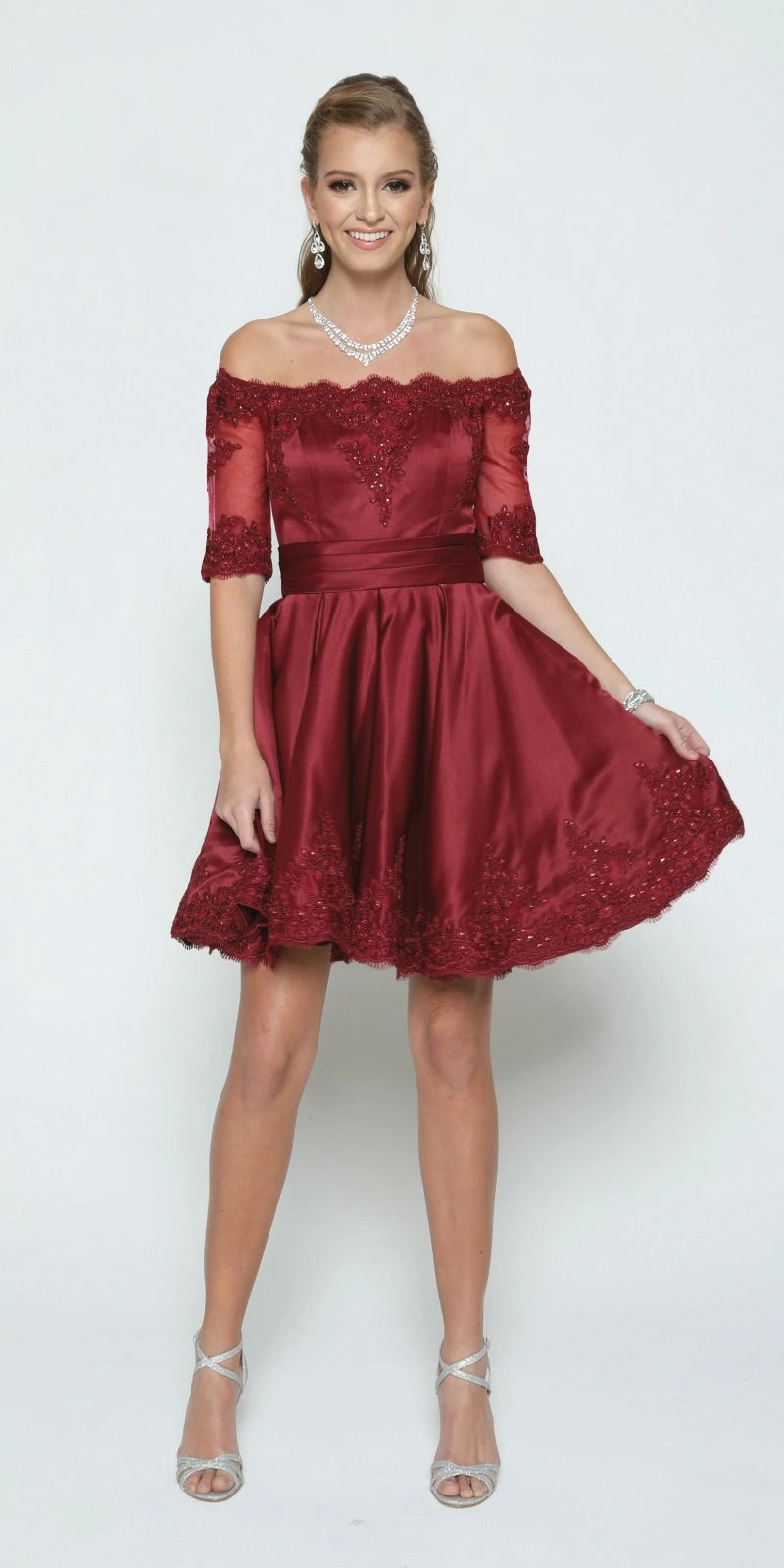Imagine yourself in this trendy off-shoulder style short dress by Juliet 804. A gorgeous cocktail dress with scallop neckline, illusion quartet sleeves decorated with appliques as well as the hemline. A layers of pleating in the waist accentuate the natural waist of this pretty dress and a corset lace-up back for easy adjustments. This is an excellent outfit for homecoming, prom, wedding events or any other special celebrations.