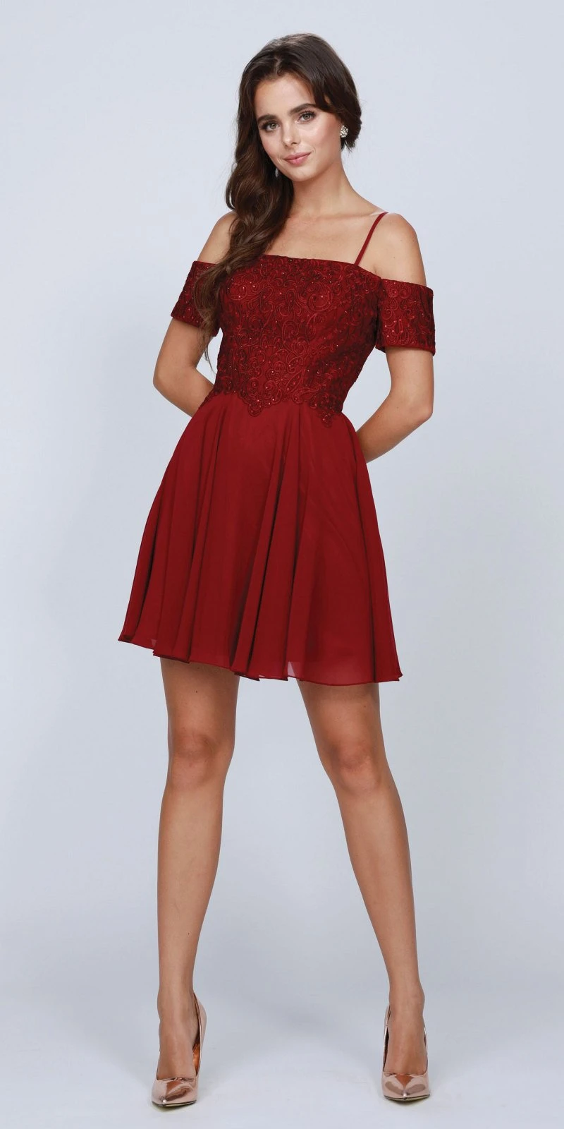 Imagine yourself in this gorgeous cold-shoulder style short party dress by Juliet 814. Made of chiffon, the bodice is appliqued dotted with bead with lace-up back and flowy chiffon skirt. An a-line silhouette short dress, ideal for bridesmaids, wedding guests, homecoming, cocktail party or any other special celebrations
