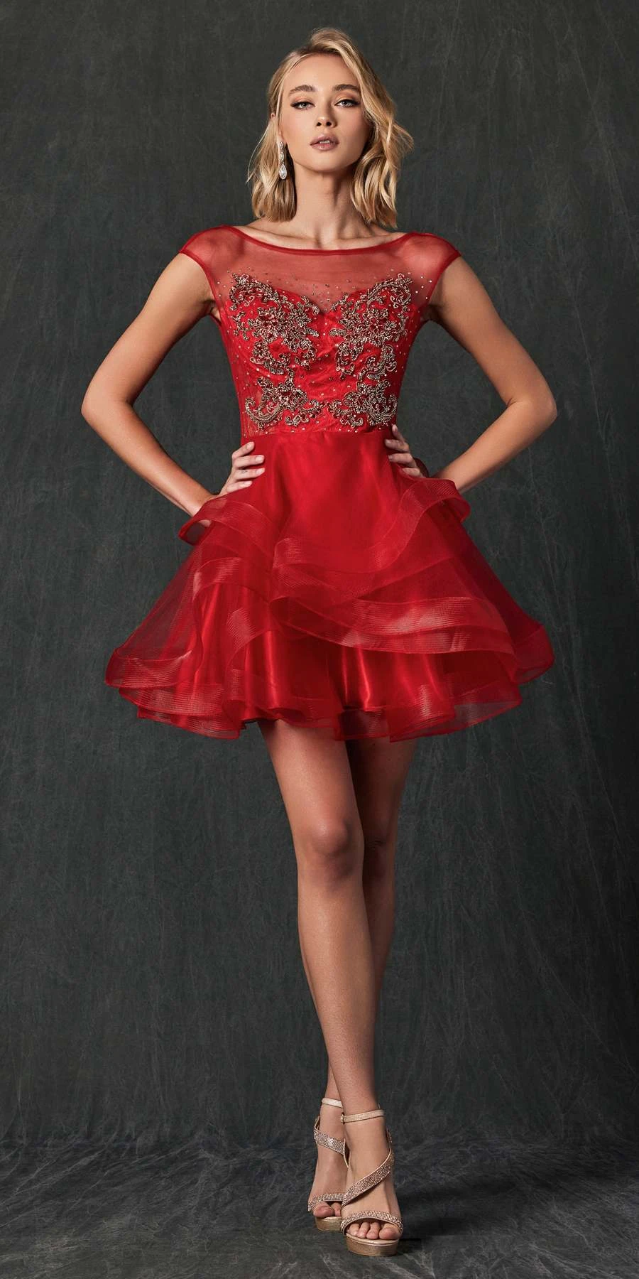 Stand out and shine with this fabulous short party dress made of tulle by Juliet 820. The bodice of this dress is intricately decorated with appliques of beads and has a deep u-shape open back with zipper. Added features with this cap sleeved short dress is the tiered tulle skirt, an amazing outfit for homecoming, prom, sweet-sixteen party or any other special celebrations.