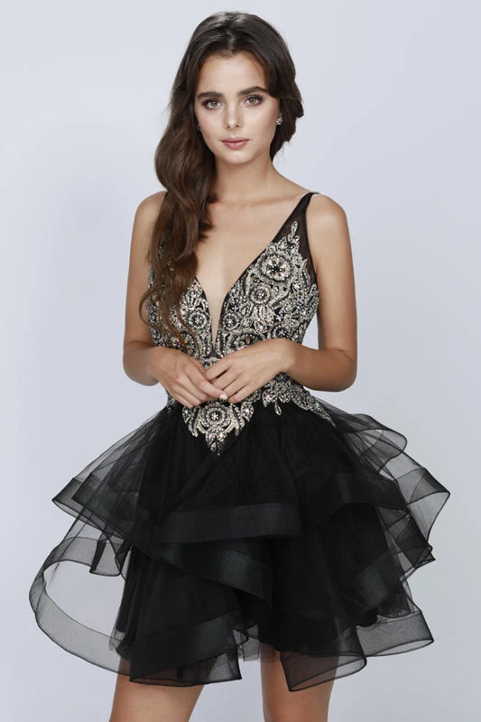 Be confidently beautiful with this made of tulle short prom dress by Juliet 823. A fabulous cocktail dress loaded with amazing features such as sequins and bead embellished bodice, plunging V-neck with sheer inset, and open back supported with thin beaded straps and the silky satin skirts has tiered tulle overlay. Fabulous outfit for prom, homecoming, sweet-sixteen or any other special celebrations.