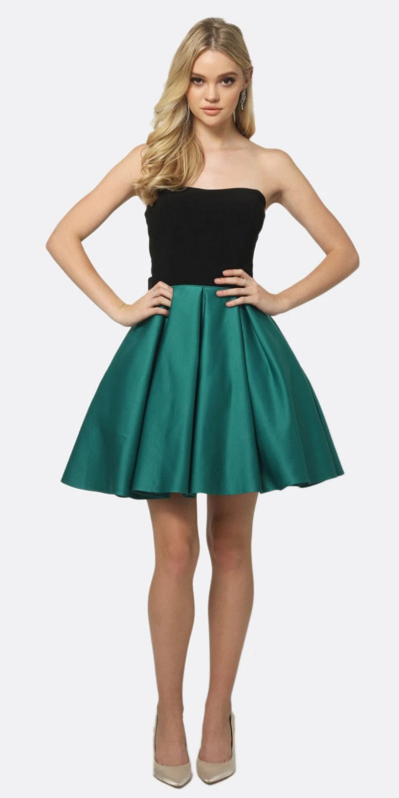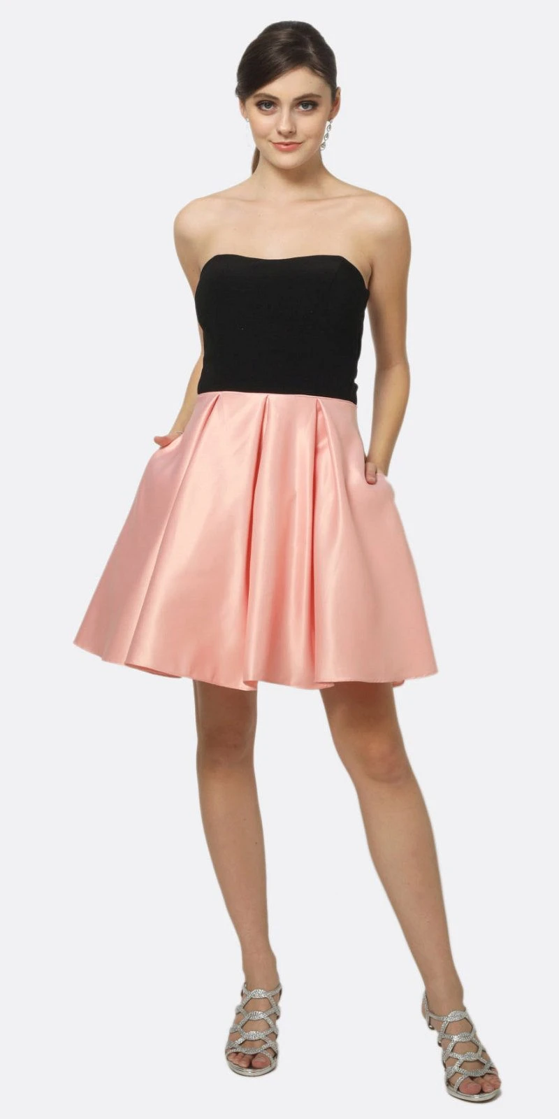 Dazzle the evening in this beautiful short A-line dress by Juliet 829, which features a strapless neckline, illusion caged side cut outs and side pockets. A beautiful short fit and flare A-line dress for homecoming, a party or any special occasion!