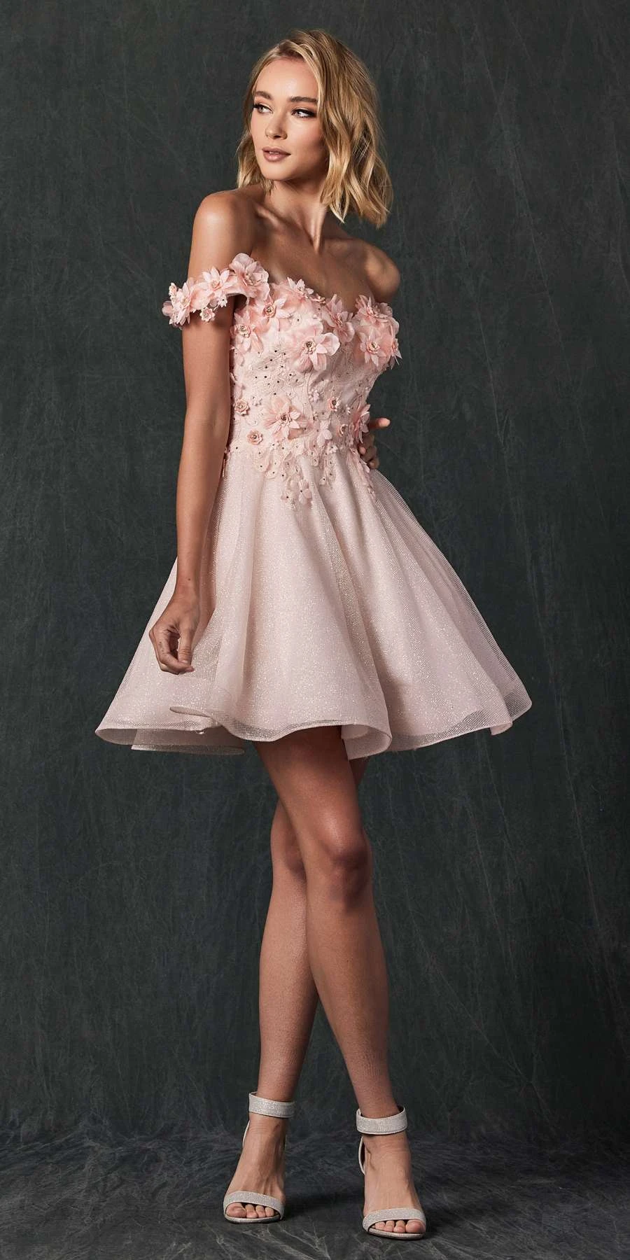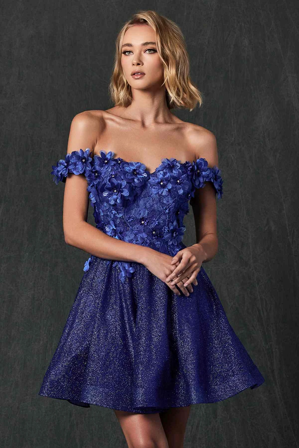 Dazzle the evening in this beautiful short A-line glitter mesh dress by Juliet 861, which features an off the shoulder strap design, with 3D floral applique, rhinestones that accent the bodice and zipper back. A beautiful short fit and flare A-line dress for homecoming, damas, prom or any special occasion!