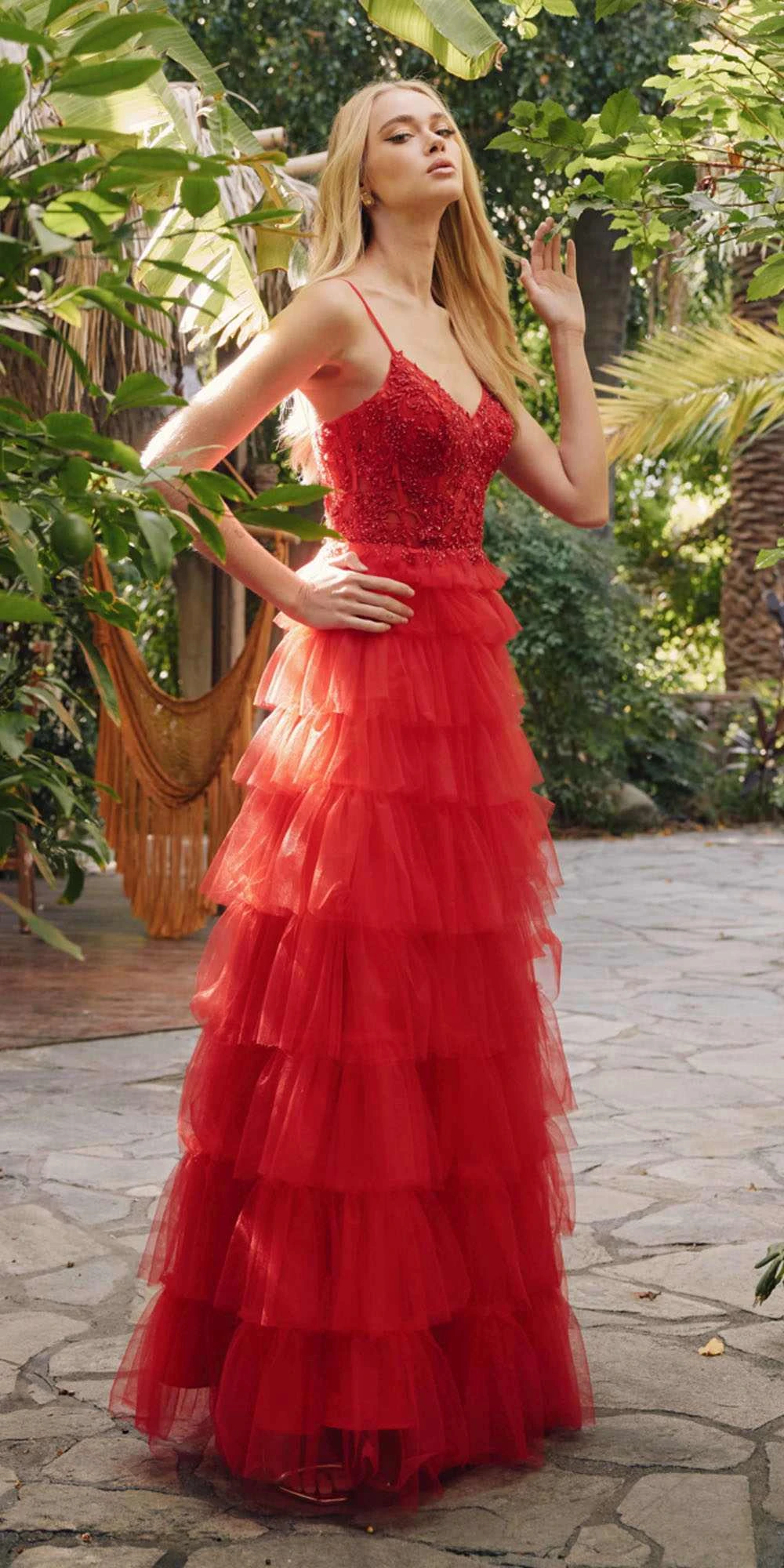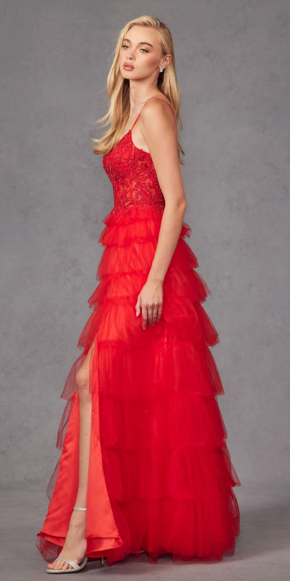 Introducing the Juliet JT2451S, a formal A-line dress perfect for dancing the night away. With a refreshing ruffle tulle design, this dress also features a lace corset boned bodice and thin spaghetti straps for an elegant look. The open corset lace-up tie back adds a touch of sophistication, while the embroidered and beaded detailing adds a hint of glamour. Complete with a V-neckline, floor length, leg slit, and sweep train, this dress is a must-have for any formal occasion. An ideal full-length dress for red carpet events, pageant, prom or in any other formal occasions!
