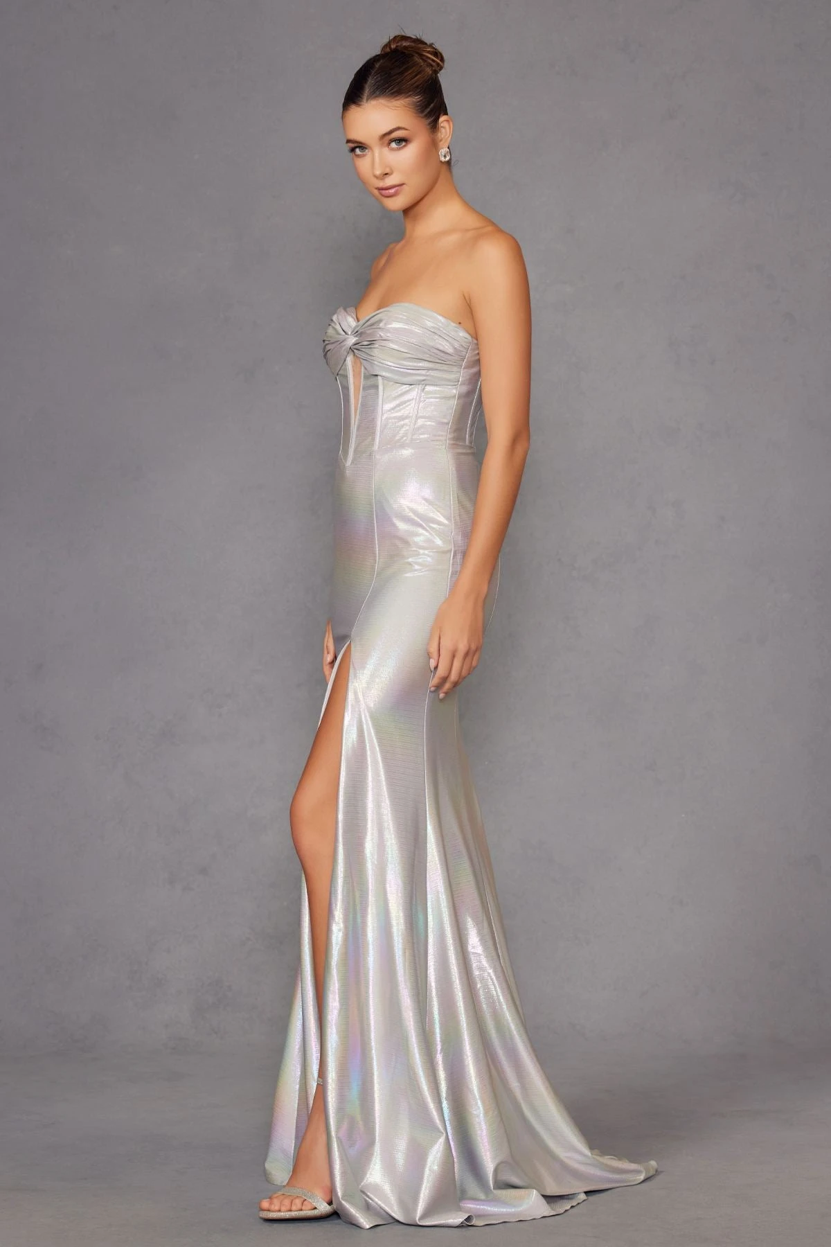 The design boasts a strapless sweetheart neckline, elegantly framed by a twisted knot detail at the bust, which creates an alluring keyhole cutout. A thigh-high slit on one side adds a hint of allure, making this gown both elegant and daring. Ideal for proms, galas, or any special occasion where you want to shine, this gown is a must-have for your collection.