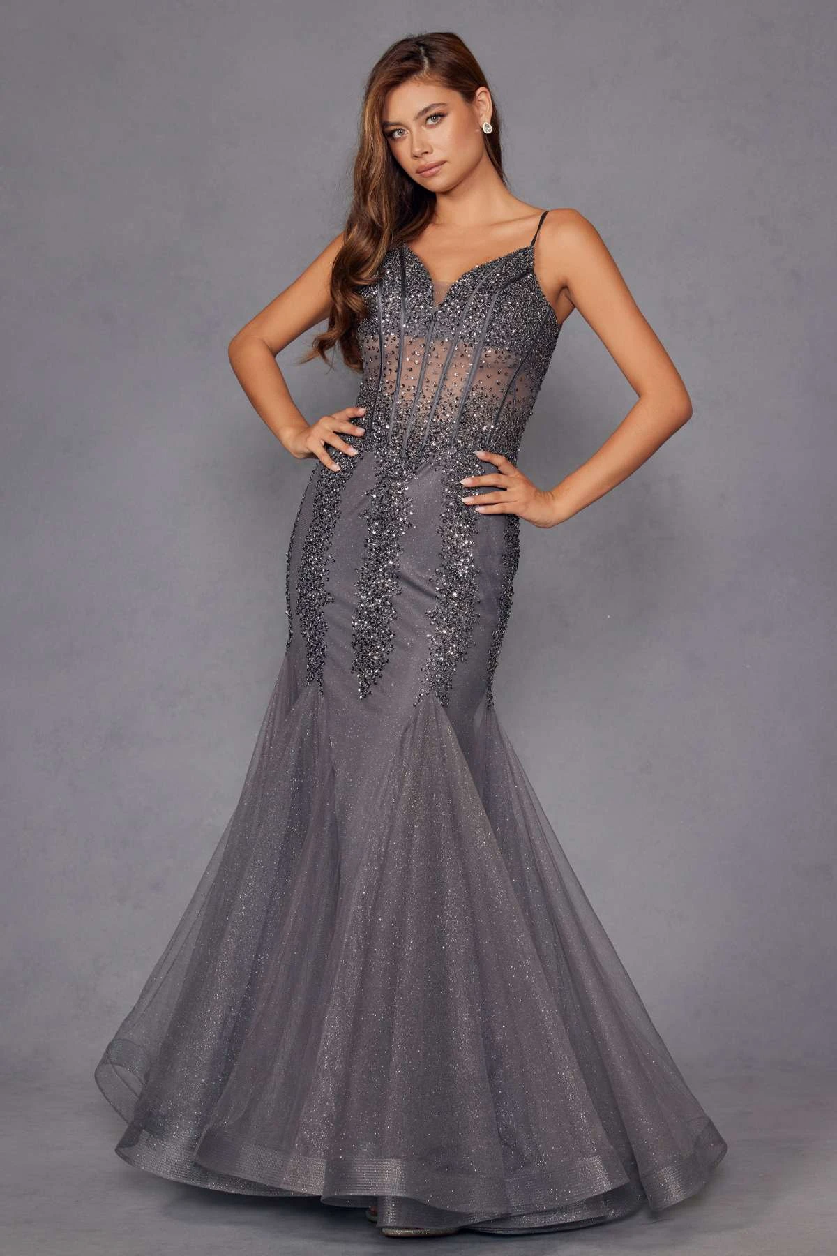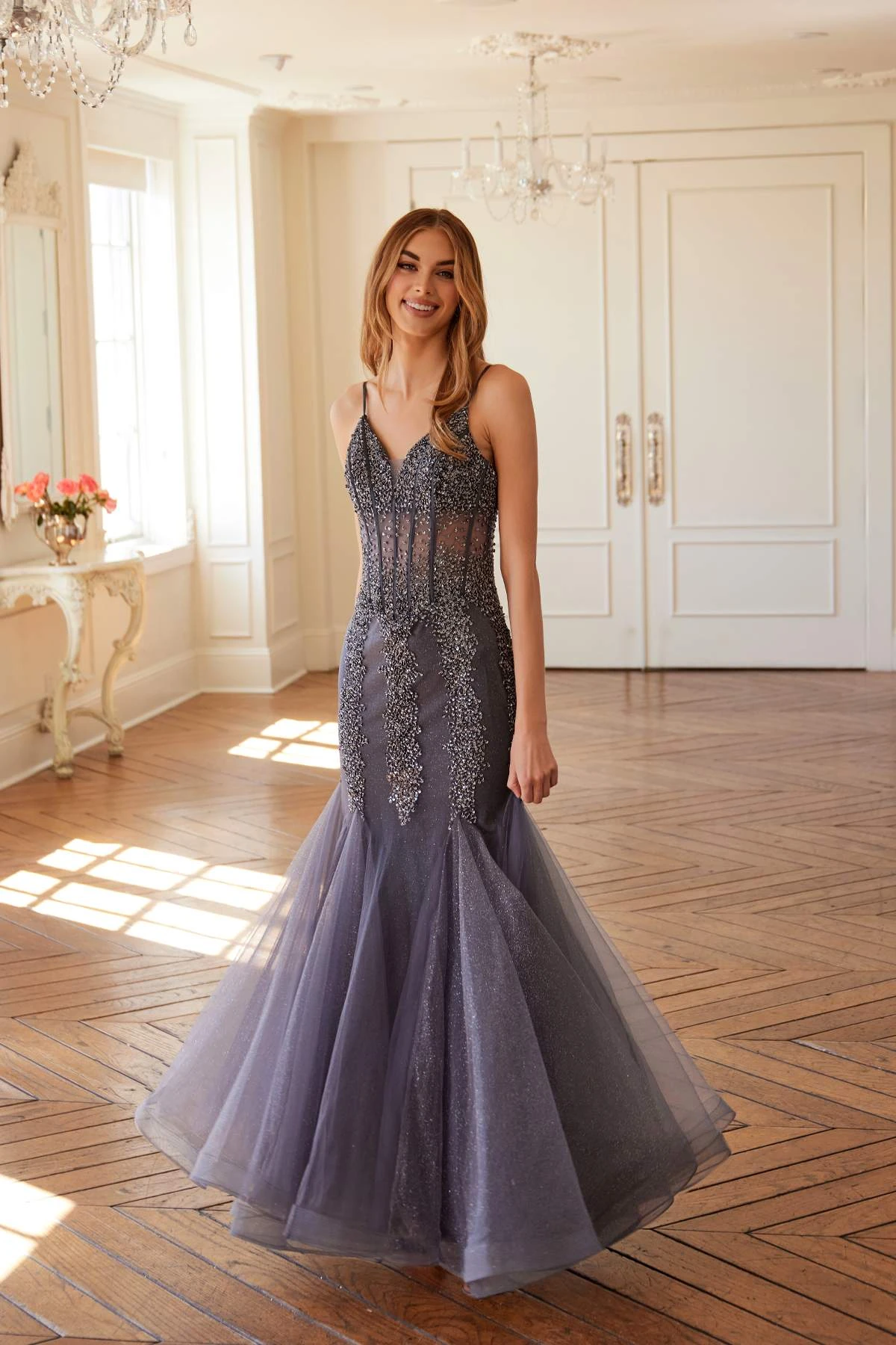 This exquisite mermaid style dress by Juliet JT2883C is designed to captivate and impress. It features a fitted corset adorned with intricate beading and sequins, creating a shimmering effect that catches the light beautifully. The dress has spaghetti straps and a sweetheart neckline, adding a touch of elegance and sophistication. The waist is cinched, accentuating the wearer’s figure, and leads into a flared mermaid skirt made of tulle. Perfect for formal events, this dress combines classic mermaid styling with modern detailing, making it an ideal choice for those looking for an elegant piece.
