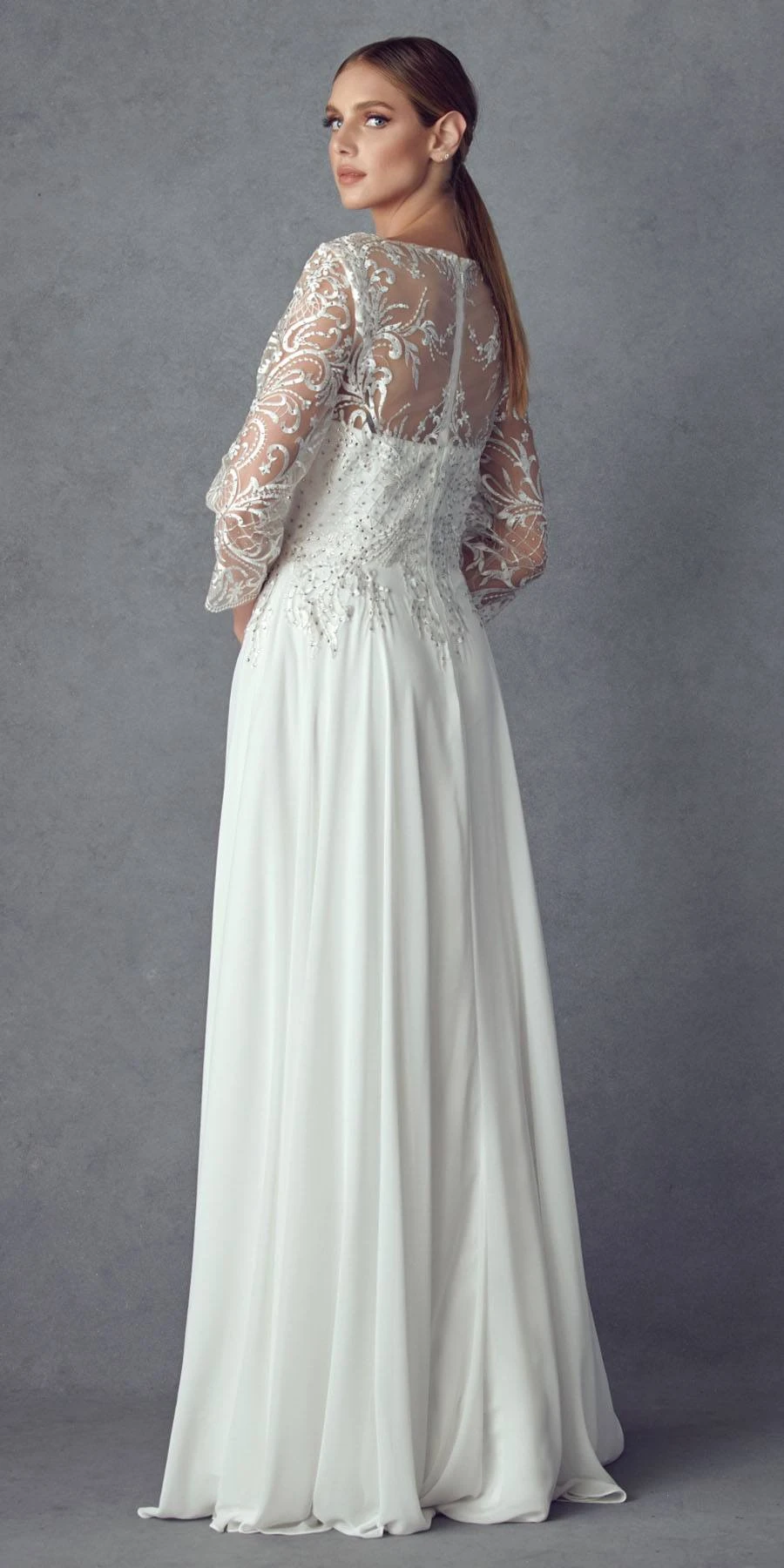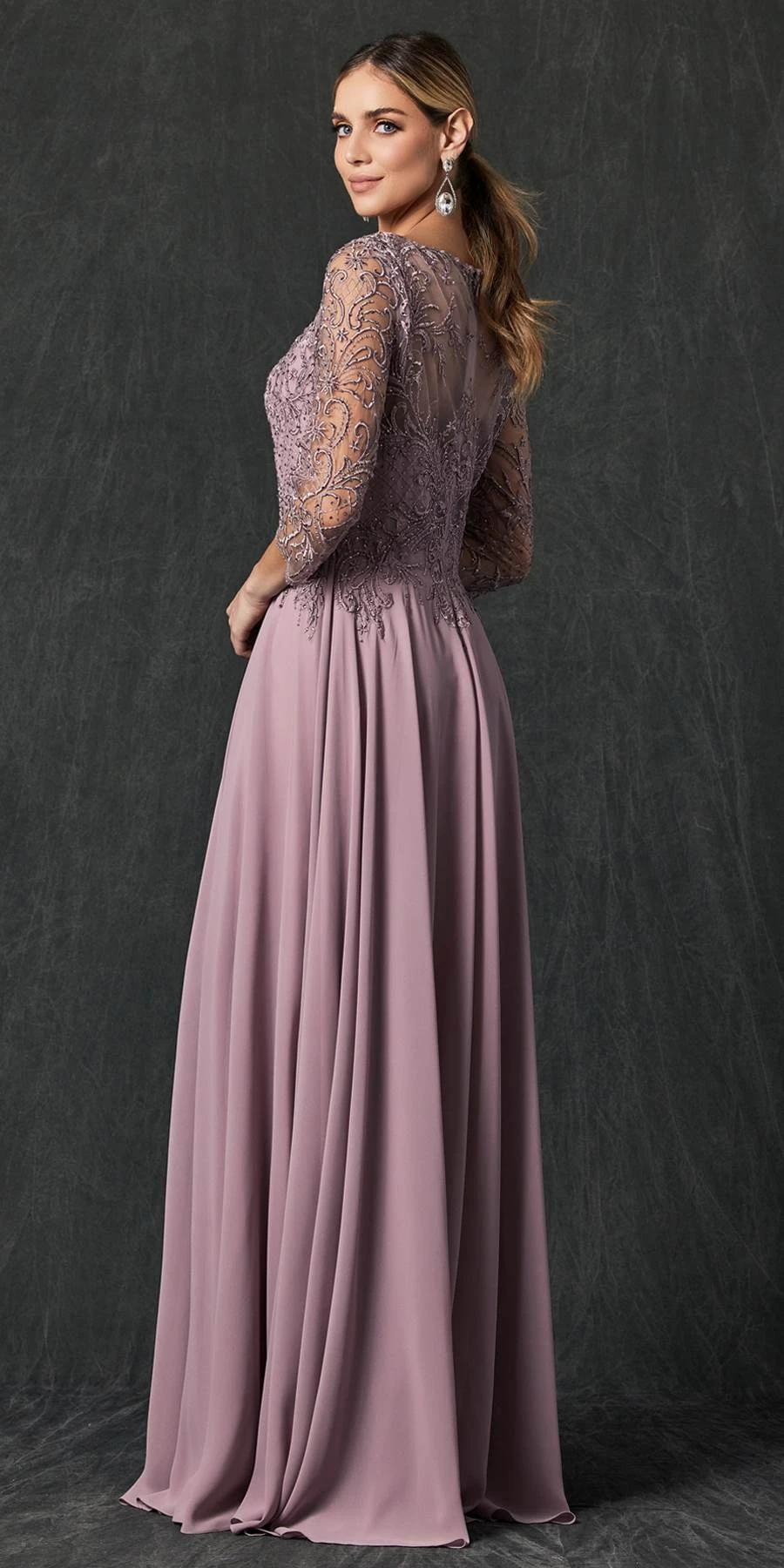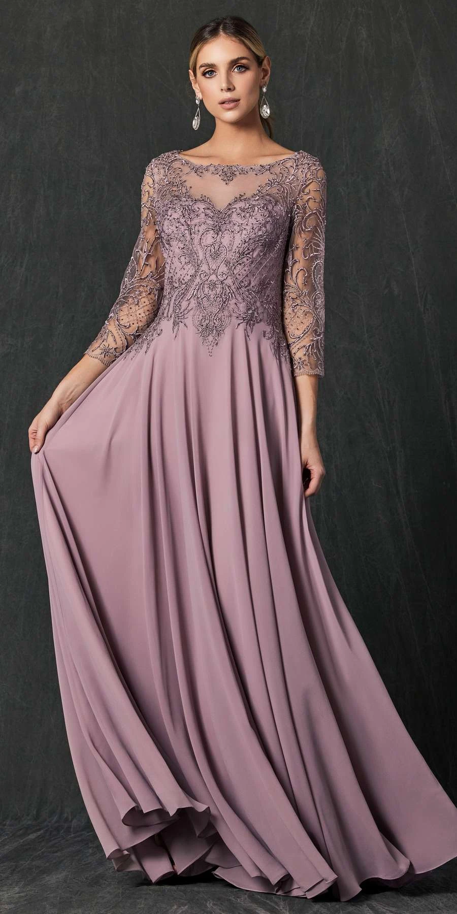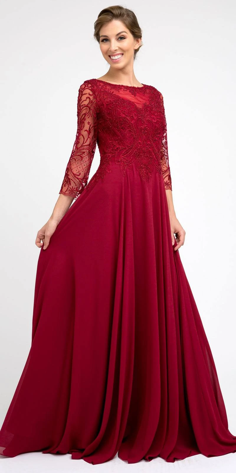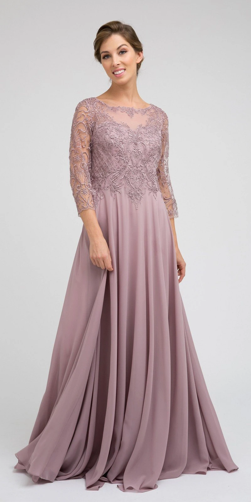 Dress up in this elegant long formal dress by Juliet M11. A full-length A-line silhouette made of chiffon dress which features an illusion embroidered bodice with transparent quarter sleeves and zipper back closure. This floor-length dress is ideal for mother’s of the bride or groom, for modest events or in any other formal or special occasion!