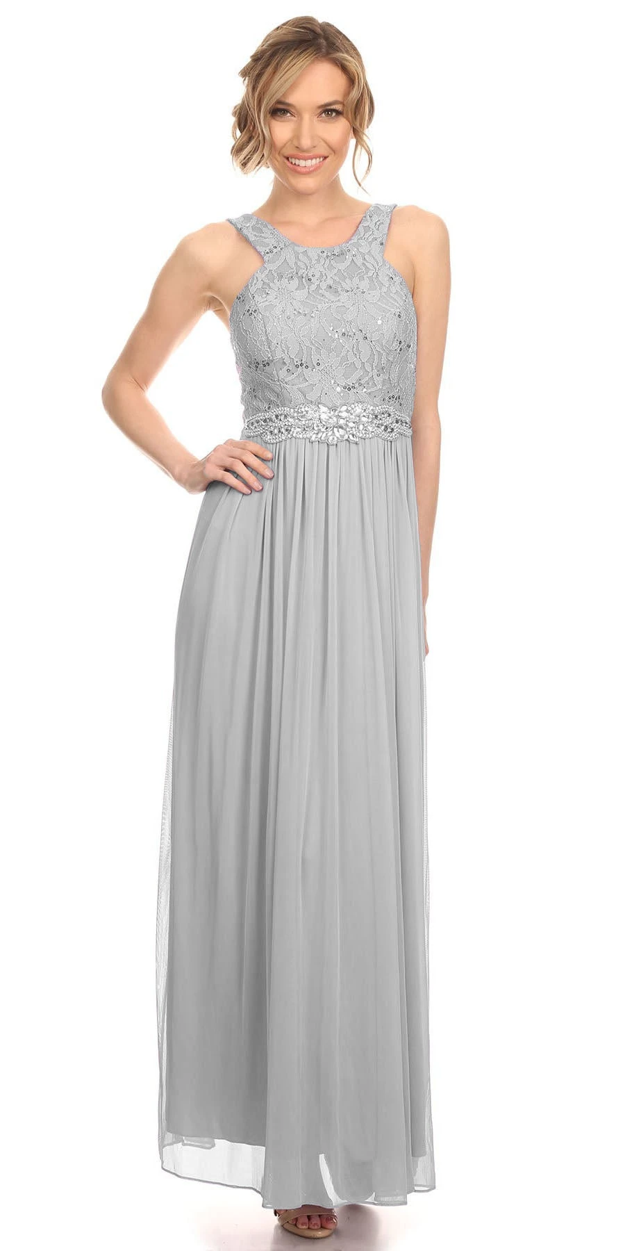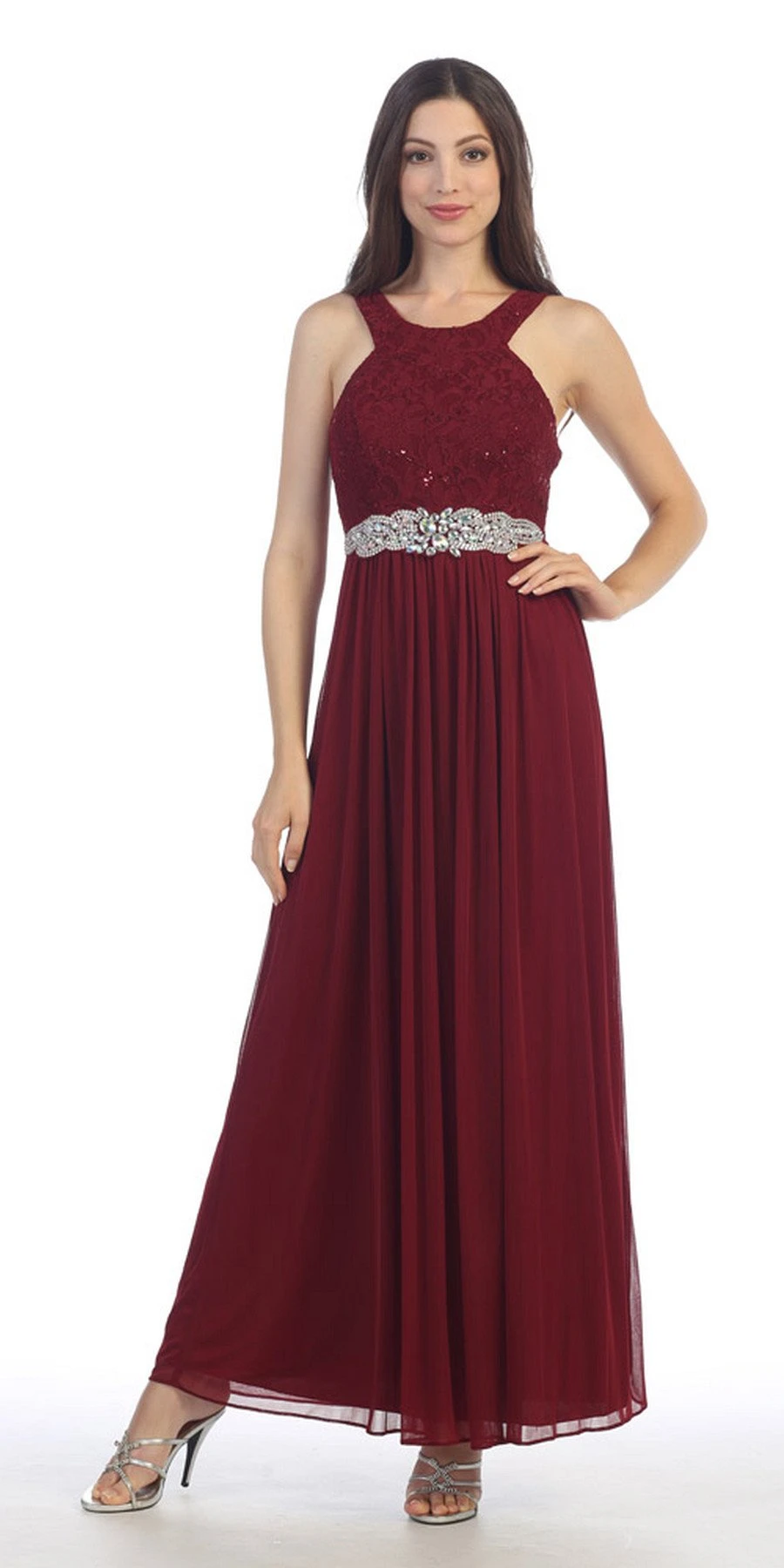 Enjoy the celebration with this beautiful A-line silhouette long formal dress by Juno 1013. The bodice is made of lace that features a halter style neckline with dazzling bead embellishment in the front of natural waist. The shirred skirt is made of chiffon and fully lined with comfy fabric, An ideal dress for bridesmaids, marine or military ball, wedding guest or in any other formal occasions!