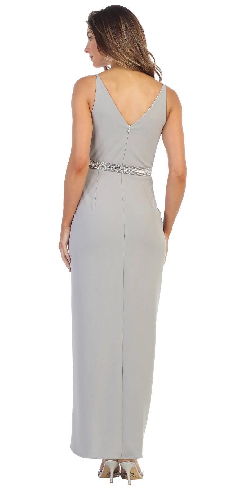 Enjoy the evening with this faux-wrap style long formal dress by Juno 1034. This dress is made of stretch crepe which feature a V-neck and back with zipper closure. The faux-wrap style emphasized by the pleating details crowns with shimmering band wraps around the natural waist. This lovely dress is perfect wedding events or in any other formal occasions!
