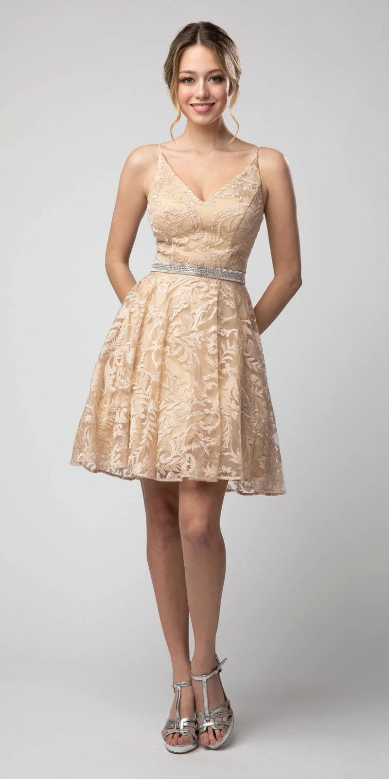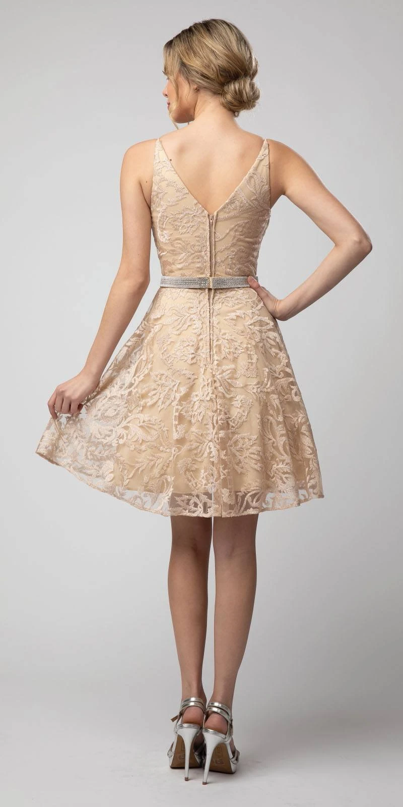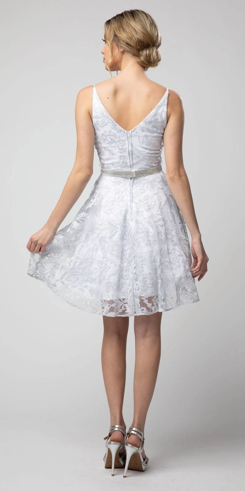 Enjoy the evening with this gorgeous embroidered short dress by Juno 1047. An a-line silhouette dress which features a v-shape neckline and back with shimmering band wraps around the natural waist. This lovely dress with spaghetti straps is an excellent outfit for homecoming, sweet-sixteen and graduation parties, wedding guests or in any other special events!