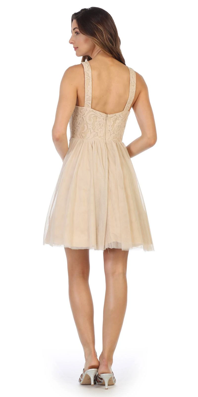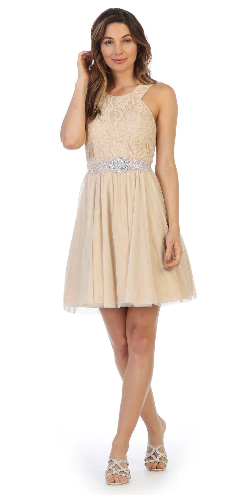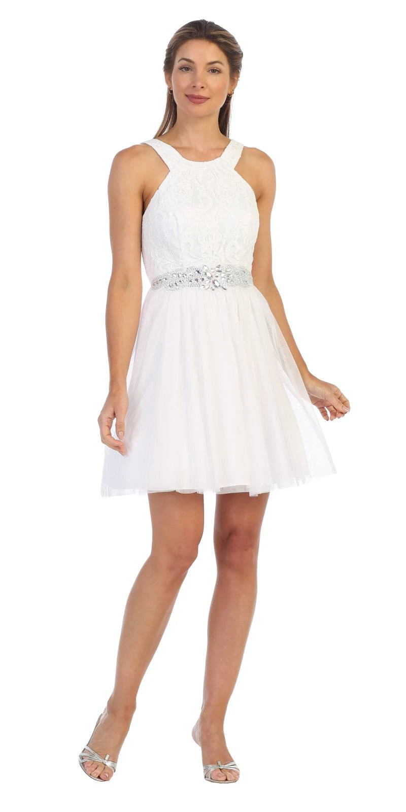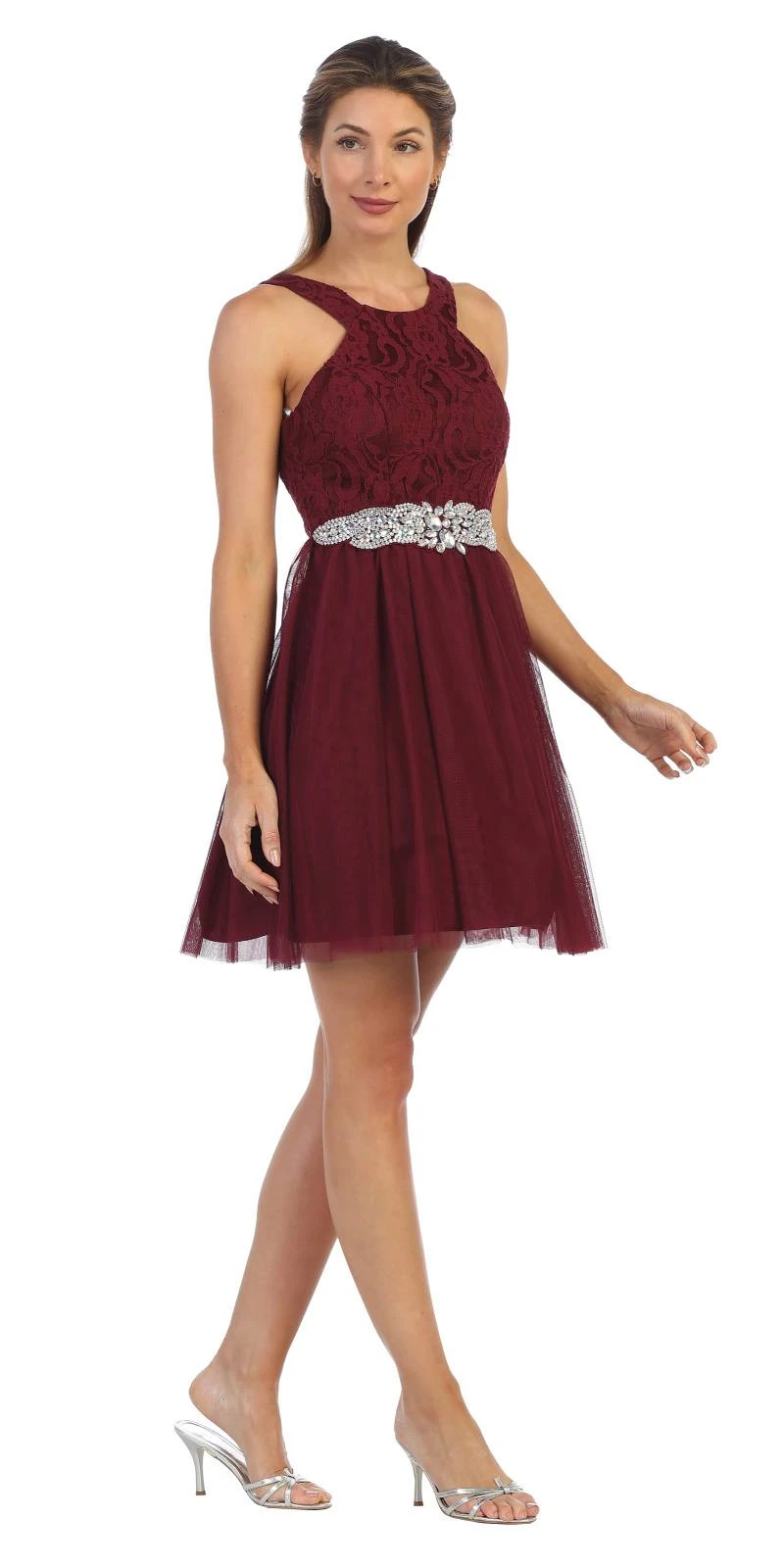 Enjoy the party wearing this gorgeous made of lace and tulle short dress by Juno 1079. The bodice is made of lace with halter high-neckline while the skirt has tulle overlay crowns with a beautiful bead work. This sleeveless short dress is fully lined with comfy fabric, an ideal outfit for cocktail or graduation parties, homecoming and wedding guests or in any other special events!