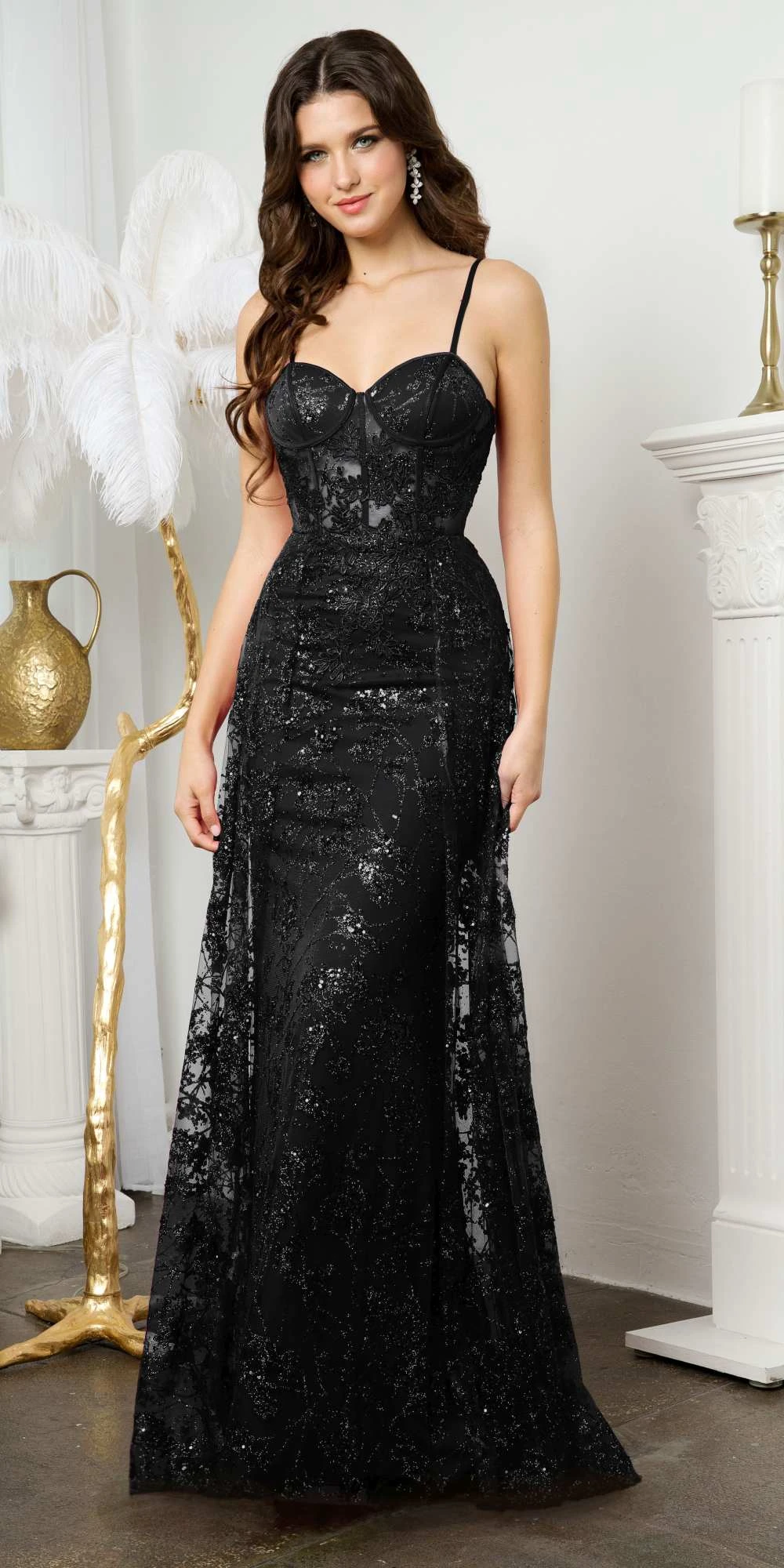 Imagine yourself in this long, fitted evening gown by Juno M1021. This sophisticated floor-length gown is tailored to flatter, with an exquisite sheer corset boned bodice, spaghetti straps, and a sweetheart neckline. Sheer tulle overlays embroidered lace embellishments, and a sweep train completes the look. A back zipper and side sash complete the design. This full-length dress is excellent outfit for red carpet events, pageant, prom or in any other formal occasions!