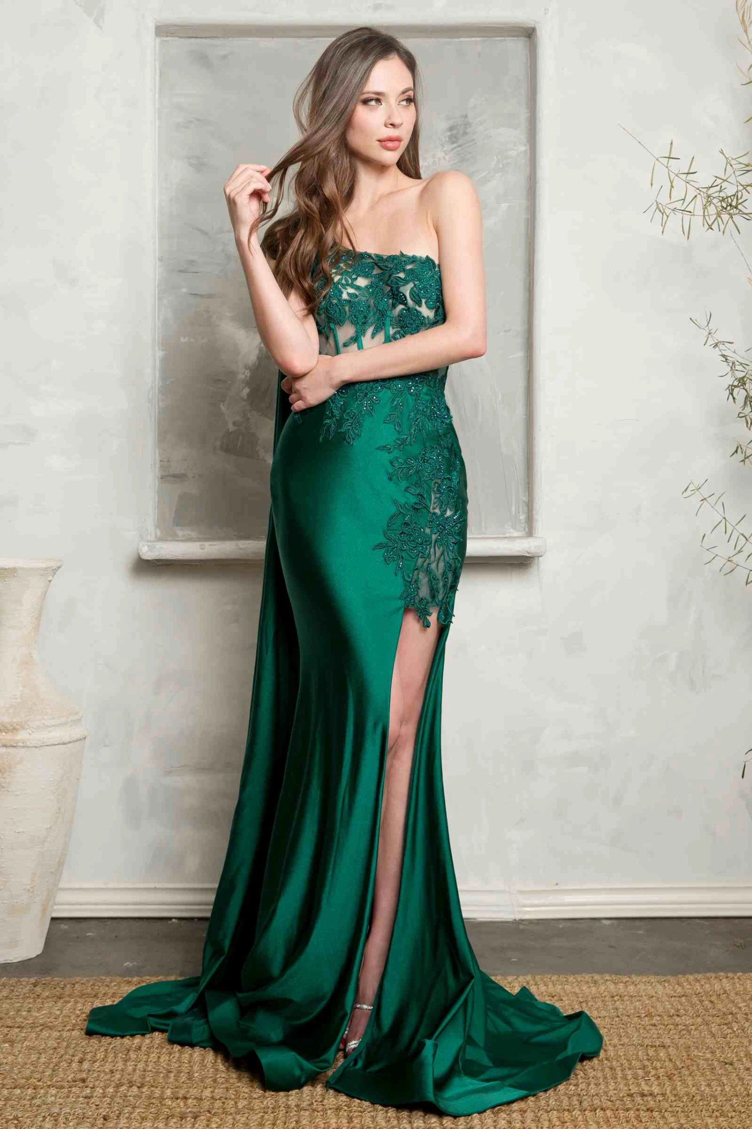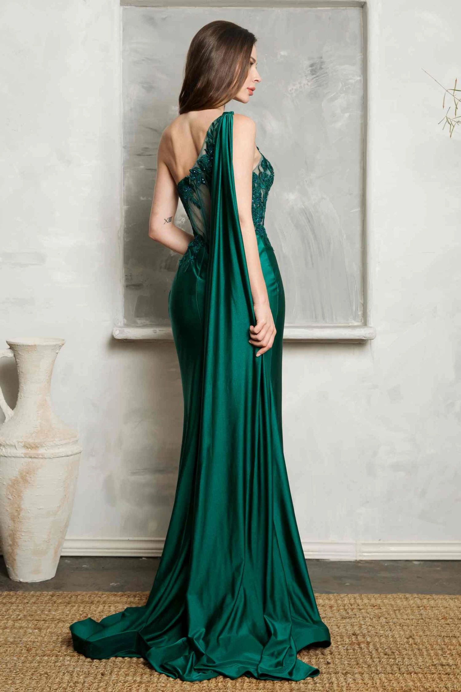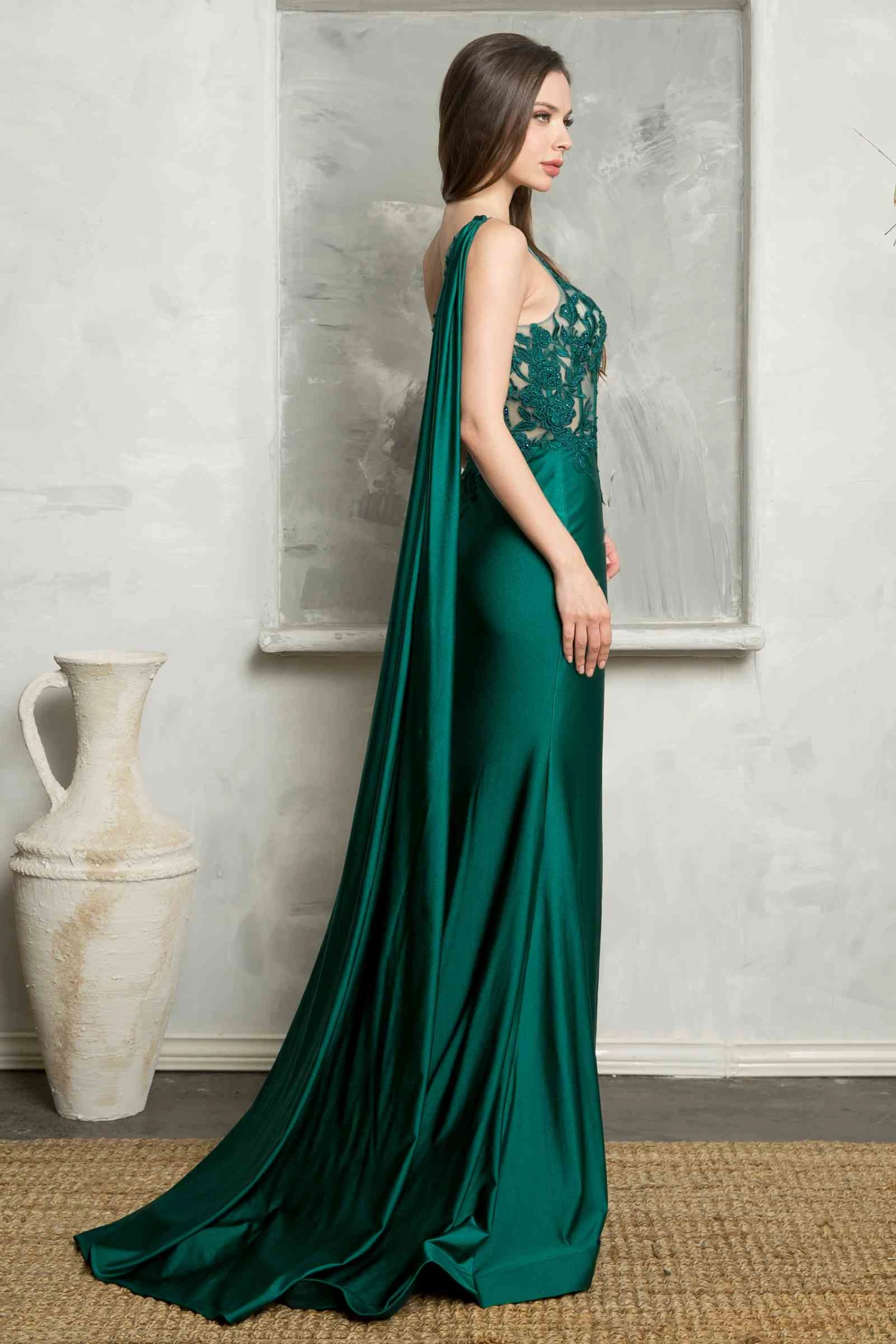 Removable sash attaches at right shoulder for a dramatic high glamour look.
