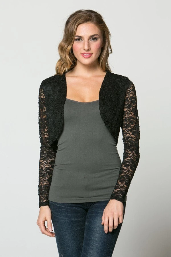 Lace, draped neckline, long sleeve, open front, cropped jacket.