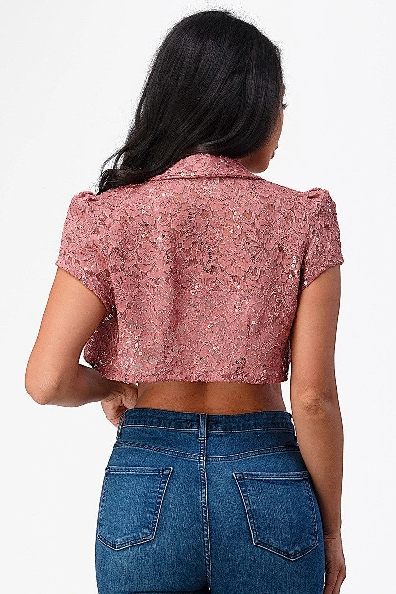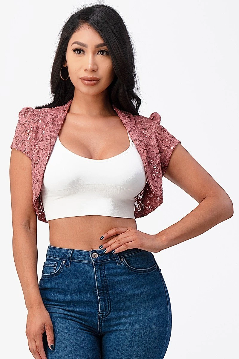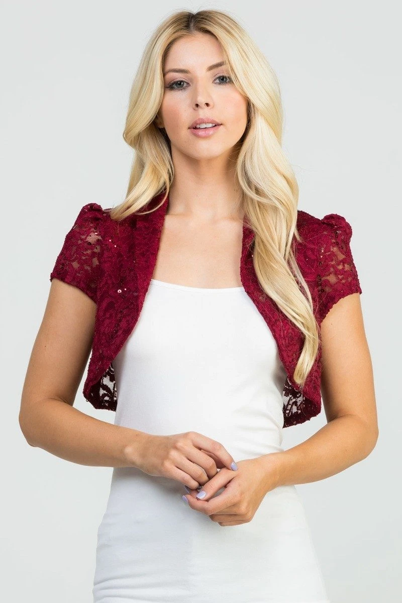 Crochet sequin lace cropped shrug with open front and cap sleeves.