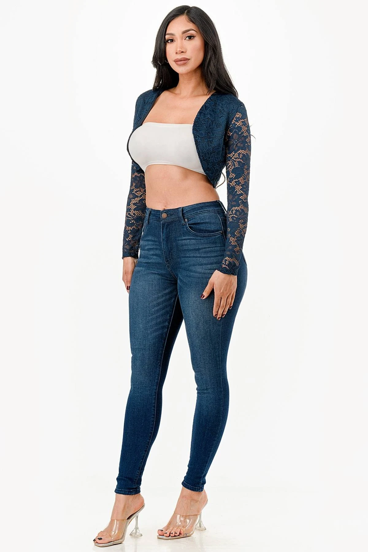 Lace, draped neckline, long sleeve, open front, cropped jacket.