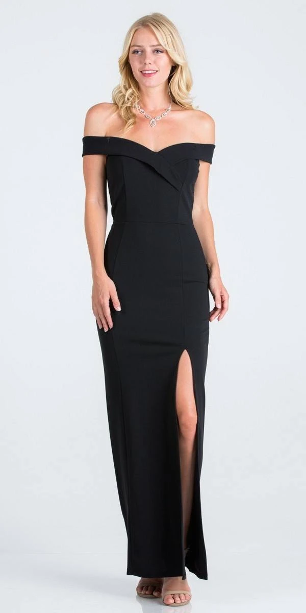 Imagine yourself wearing this trendy off-the-shoulder style dress by La Scala 25078, a form-fitting long formal dress made of scuba fabric with thigh-high slit. A gorgeous outfit for any formal or special events.