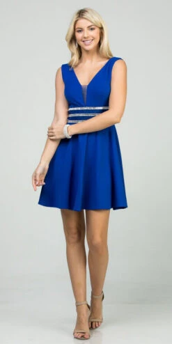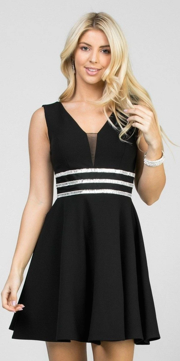 Imagine yourself in this pretty dress by La Scala 25408, which features a sequins-embellished natural waist and plunging V-neck with sheer-inset. This sleeveless short party dress with visible seams is an ideal outfit for wedding guests, cocktail and graduation parties or in any other special celebrations.